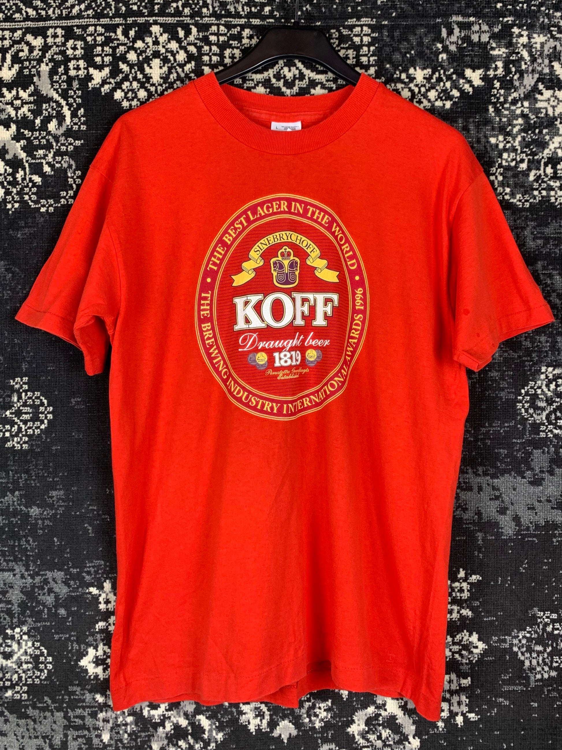 Men’s Vintage Red KOFF Beer Graphic T-Shirt – 90s Sinebrychoff Lager Tee – Fruit of the Loom Screen Stars – Large – Retro Brewery Logo Shirt