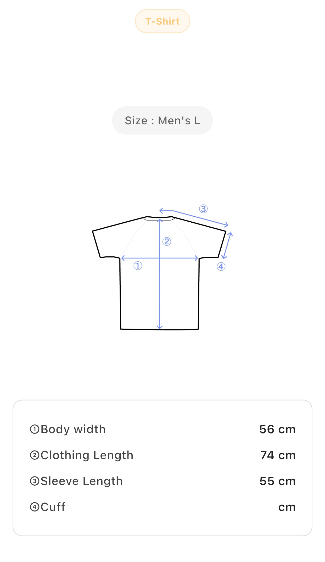 Size: Men's L; Body width 56 cm; Clothing length 74 cm; Sleeve length 55 cm