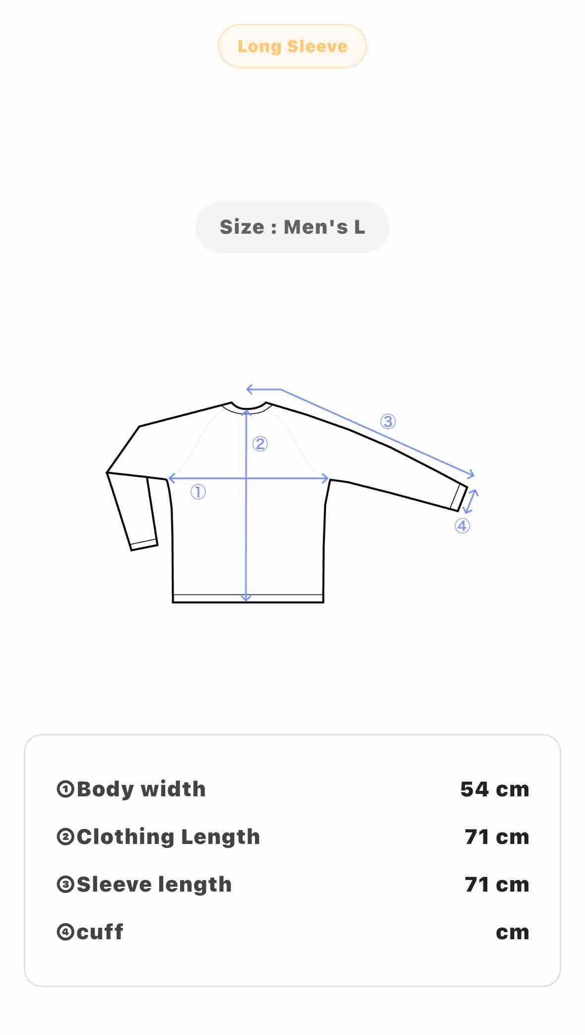 • Size: Men's L; Body Width 54 cm; Clothing Length 71 cm; Sleeve Length 71 cm