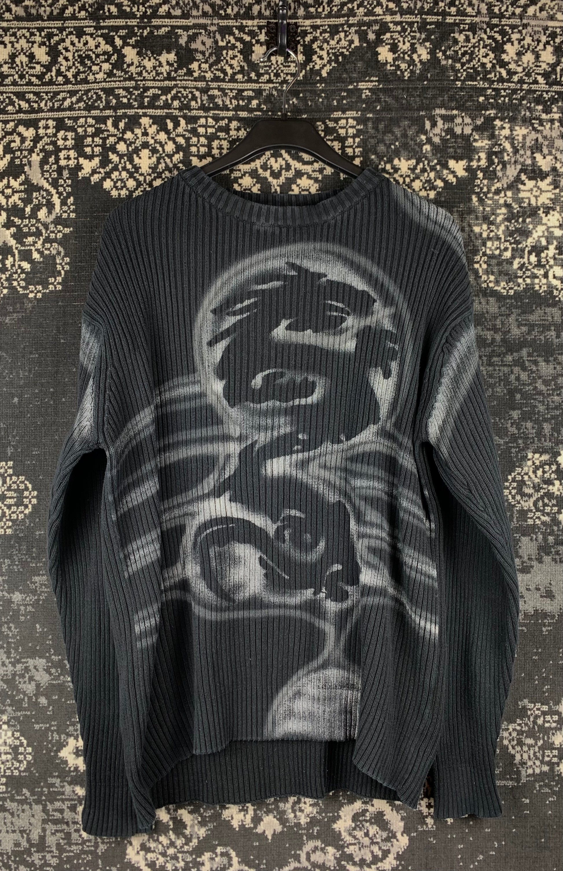 Men's Y2K Black Ribbed Sweater with Oversized Airbrushed Dragon Graphic – Grunge Aesthetic – Long Sleeve Knit – Size XL