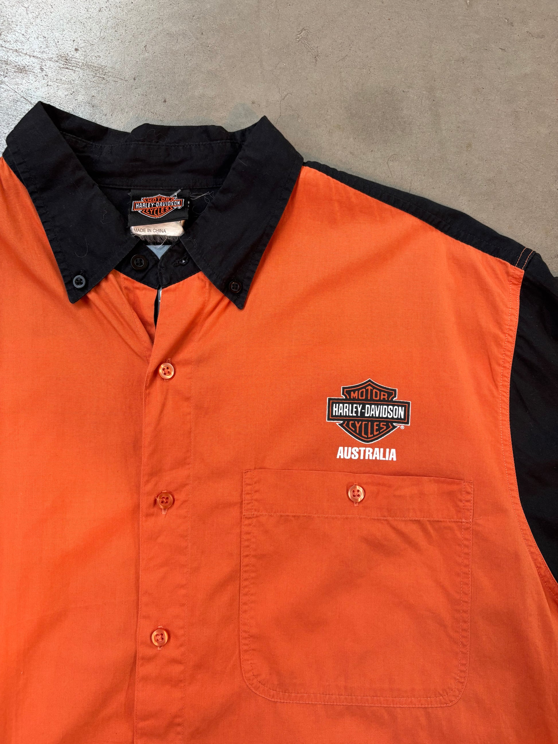 Harley Davidson Australia Button Up Shirt Orange Black Men’s XL Short Sleeve Motorcycle Biker Cotton Logo