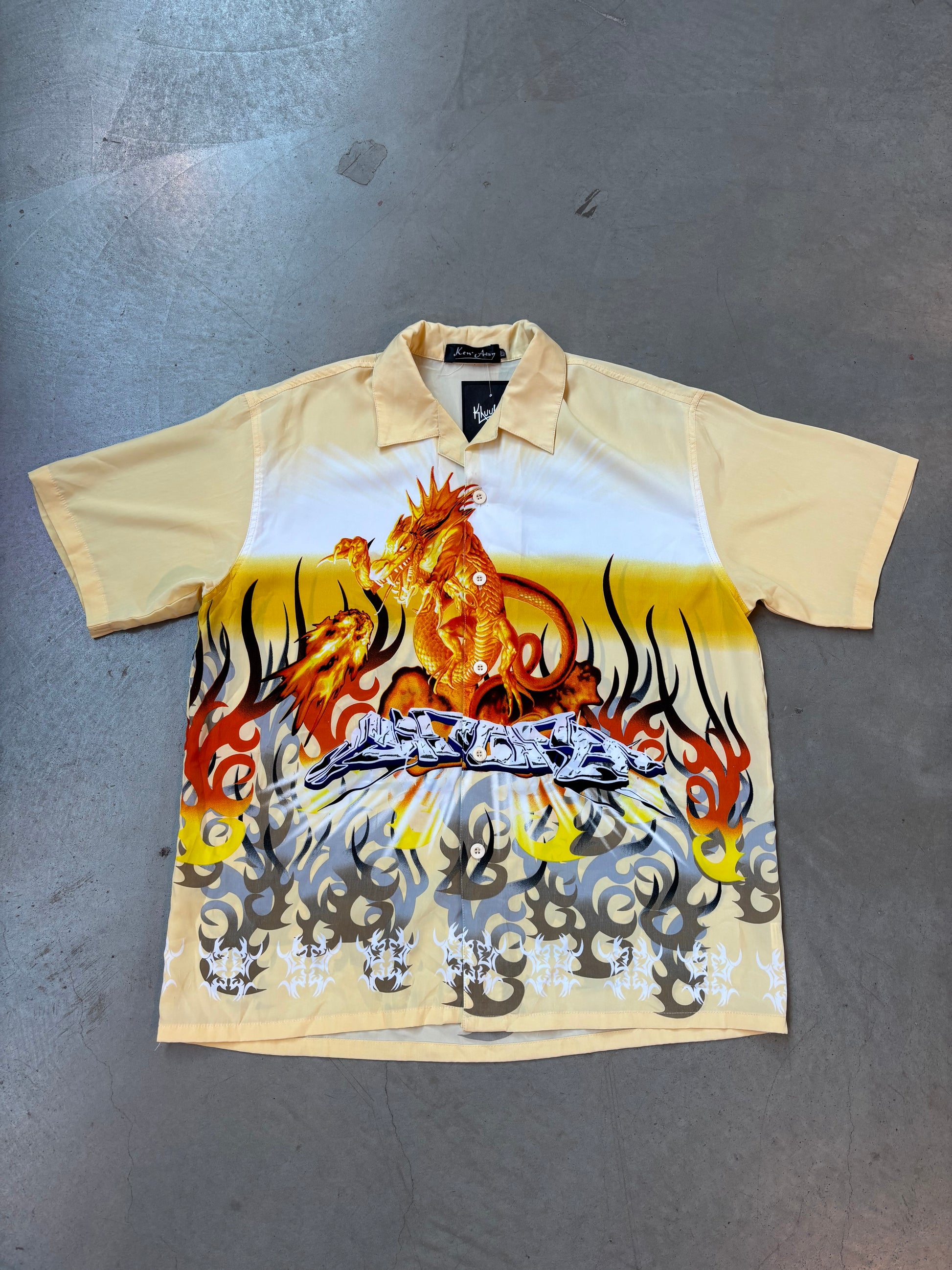 Ken’Assy Dragon Print Hawaiian Shirt With Flame Graphic Beige Yellow Men’s XL Unique Streetwear Button Up