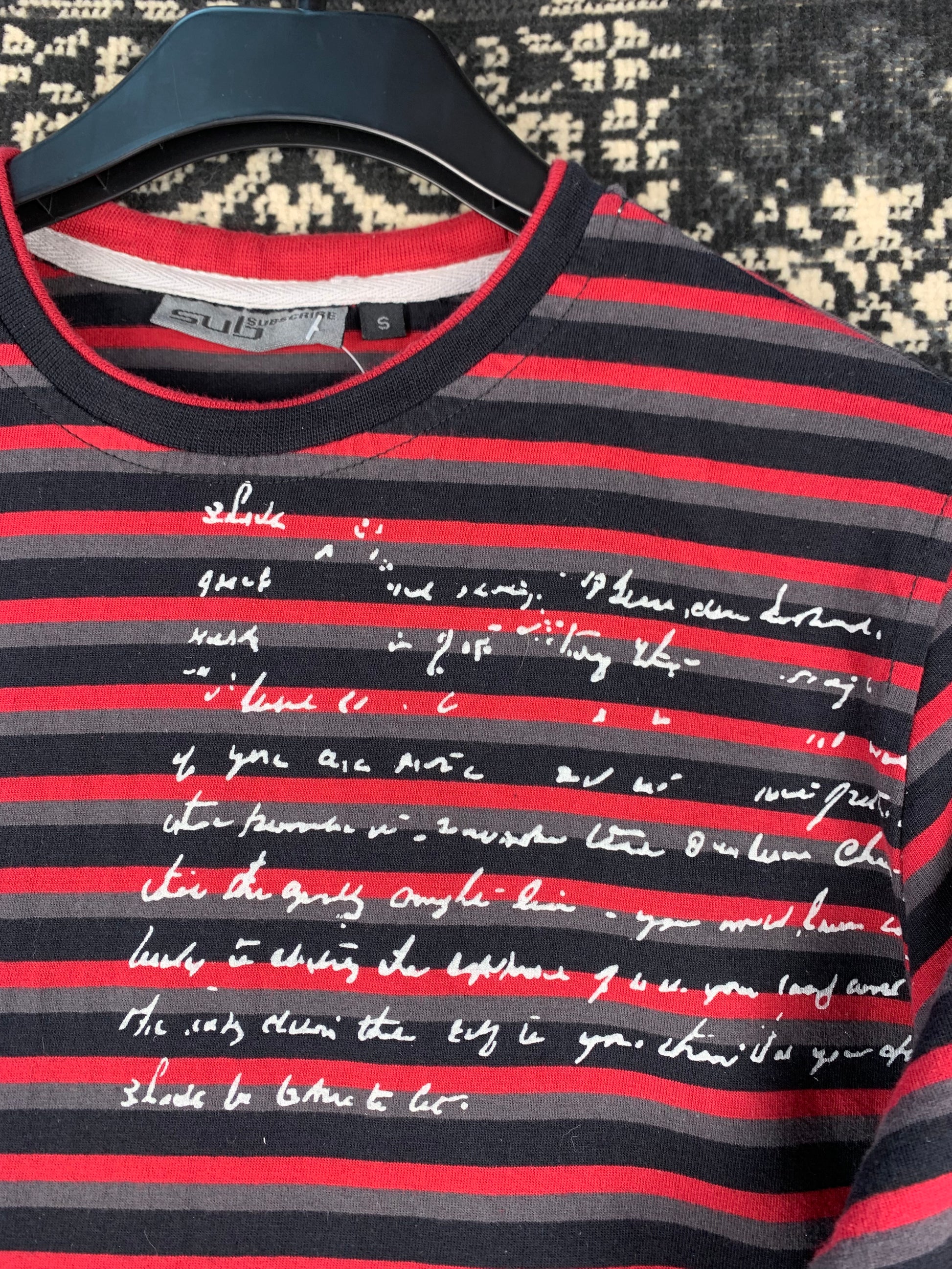 Mens Y2K SUB Subscribe Striped Long Sleeve – Graphic Script Print – Size S