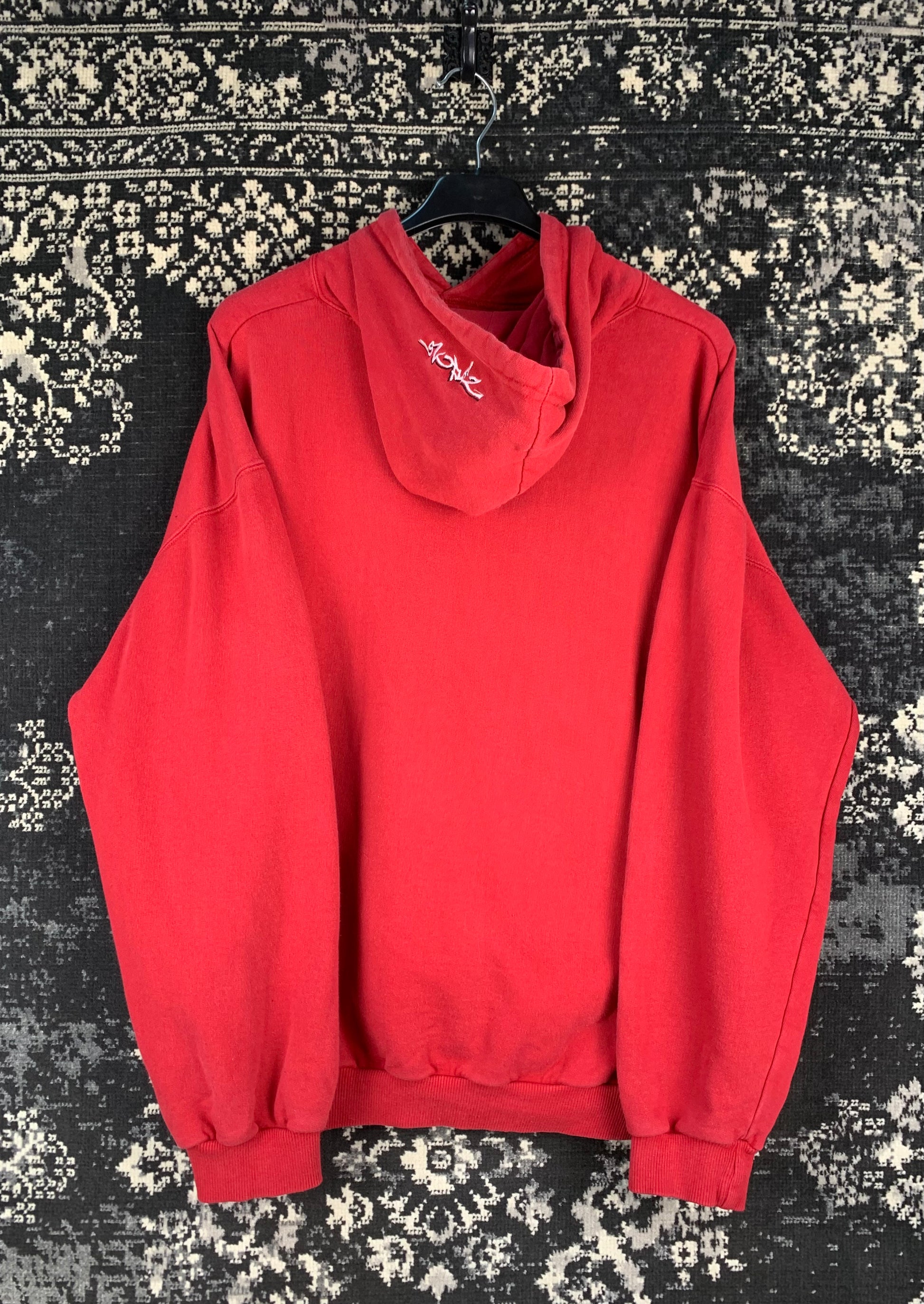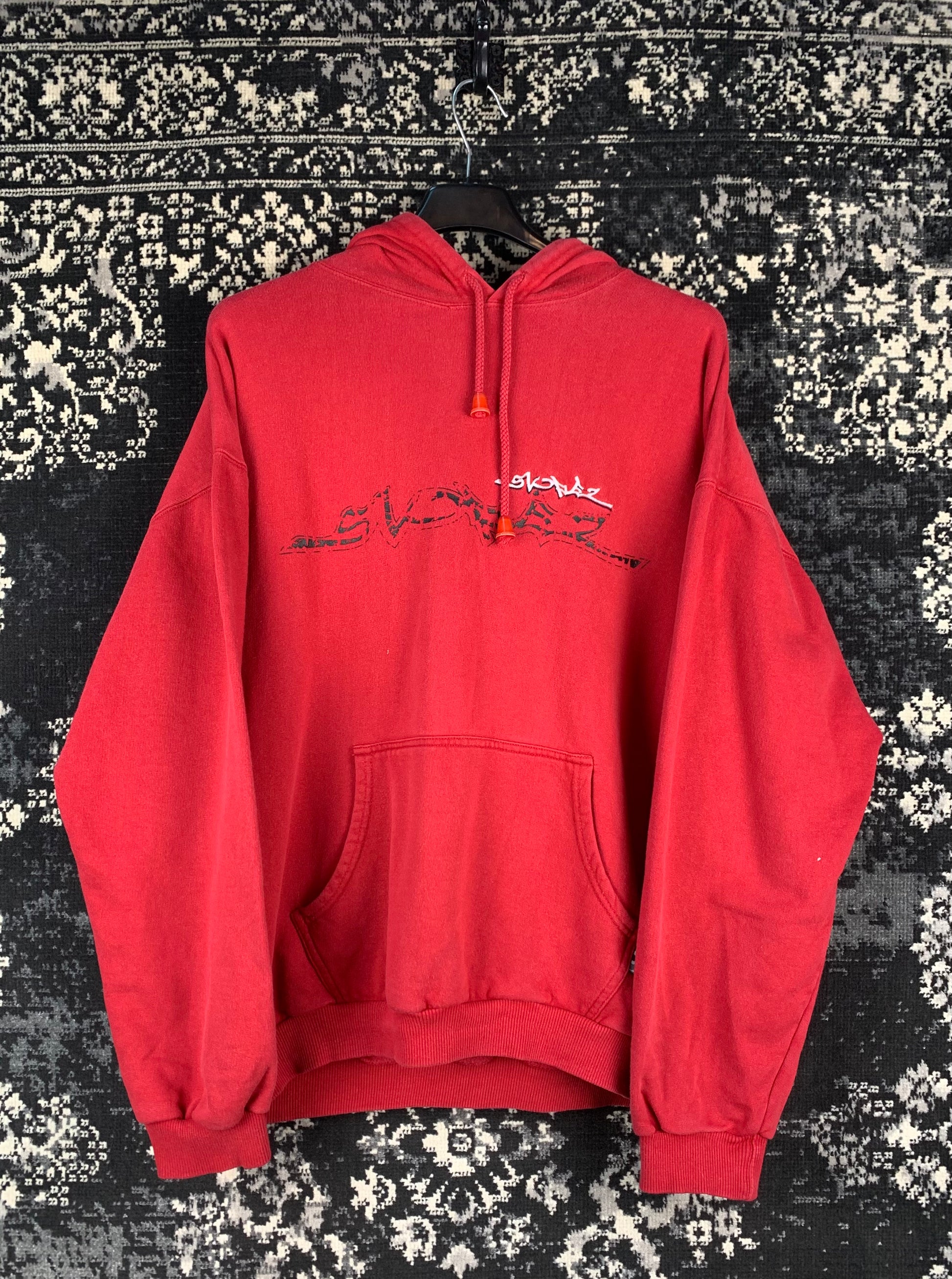 Mens Y2K Subscribe Streetwear Hoodie – Red Oversized Graphic Sweatshirt – Graffiti Logo Skater Style Pullover – Vintage Urban Look – Size M