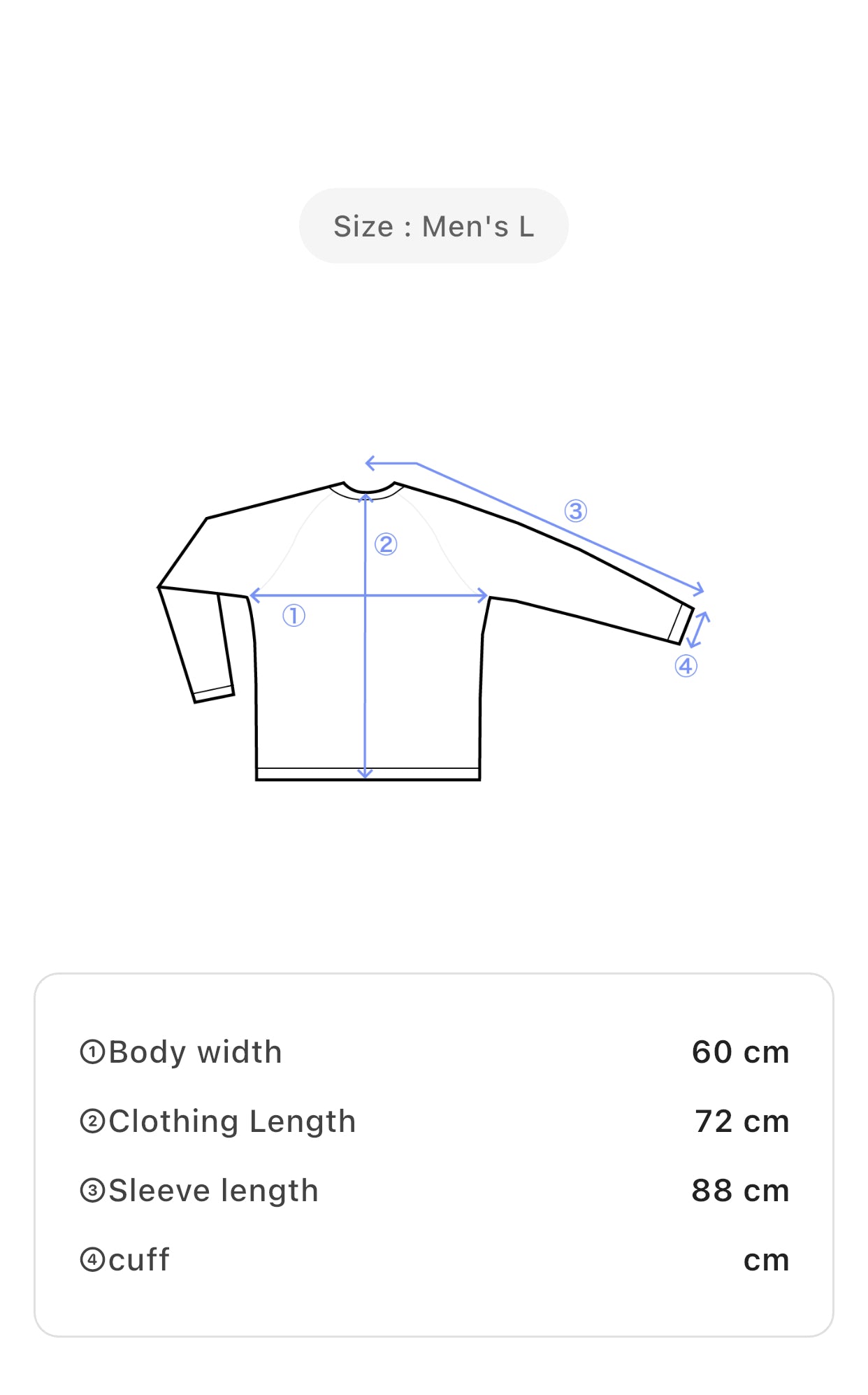 Size: Men's L — Body Width: 60 cm, Clothing Length: 72 cm, Sleeve Length: 88 cm