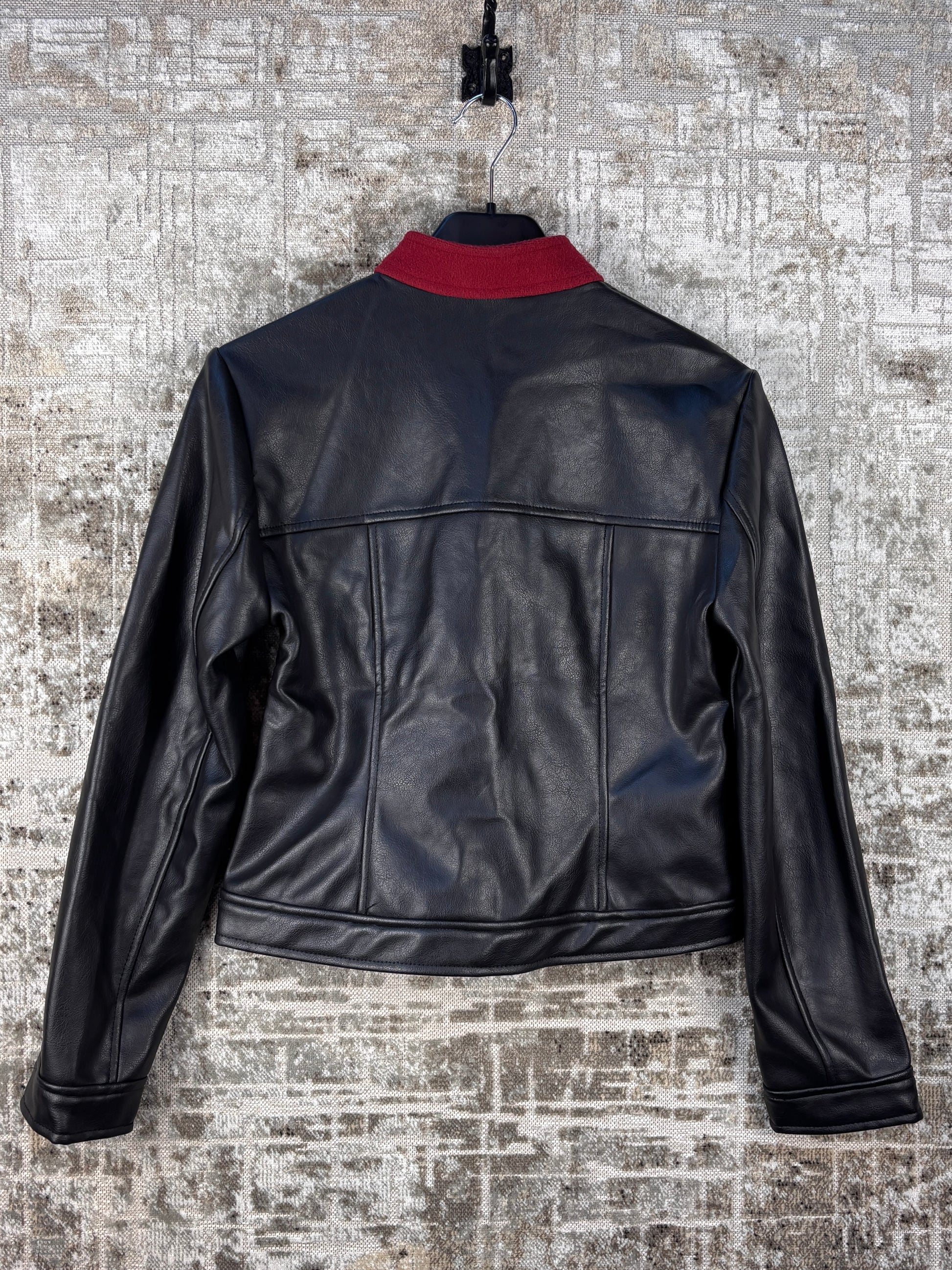 Unisex Vintage Black Leather Jacket Red Collar Detail