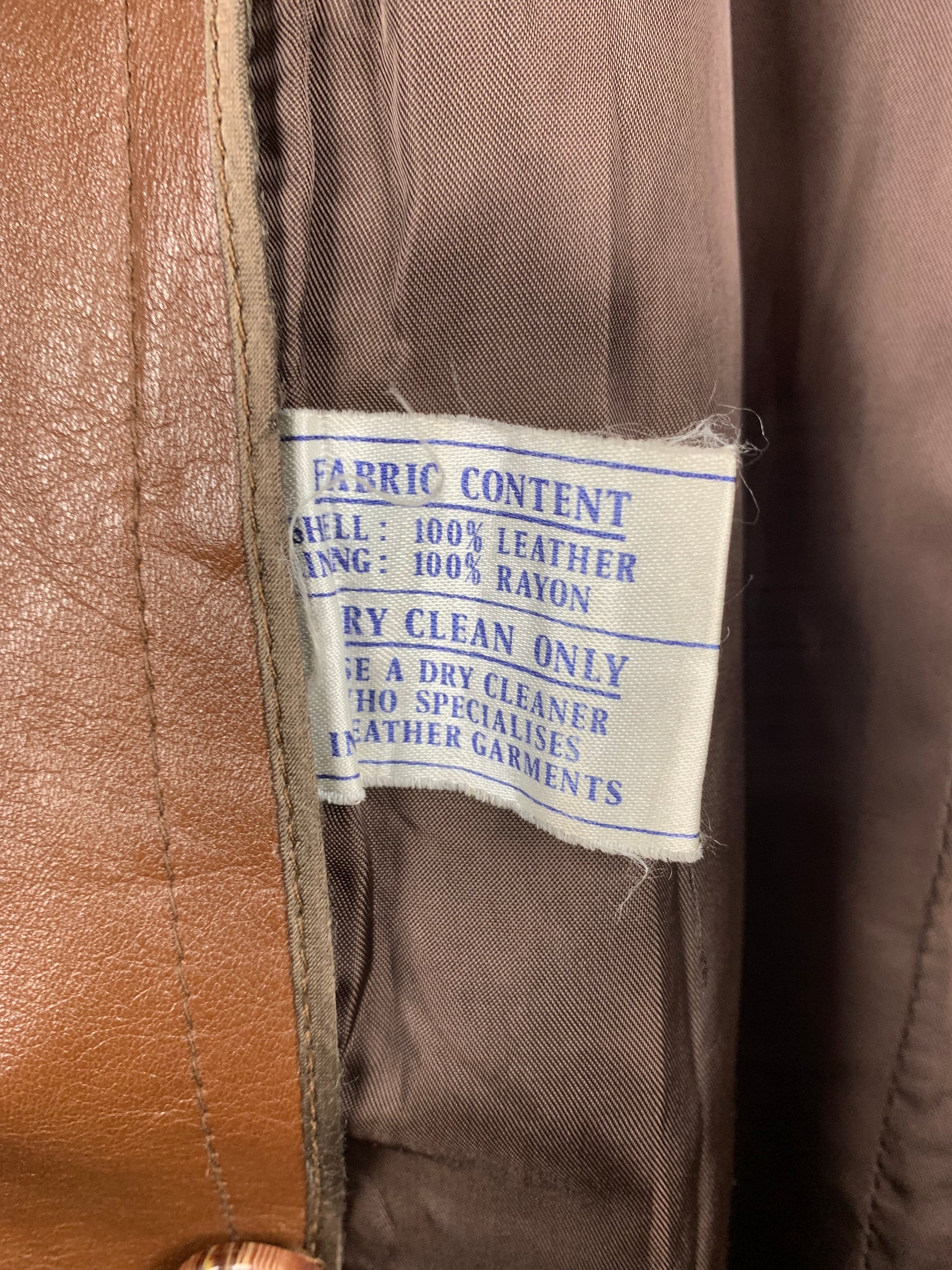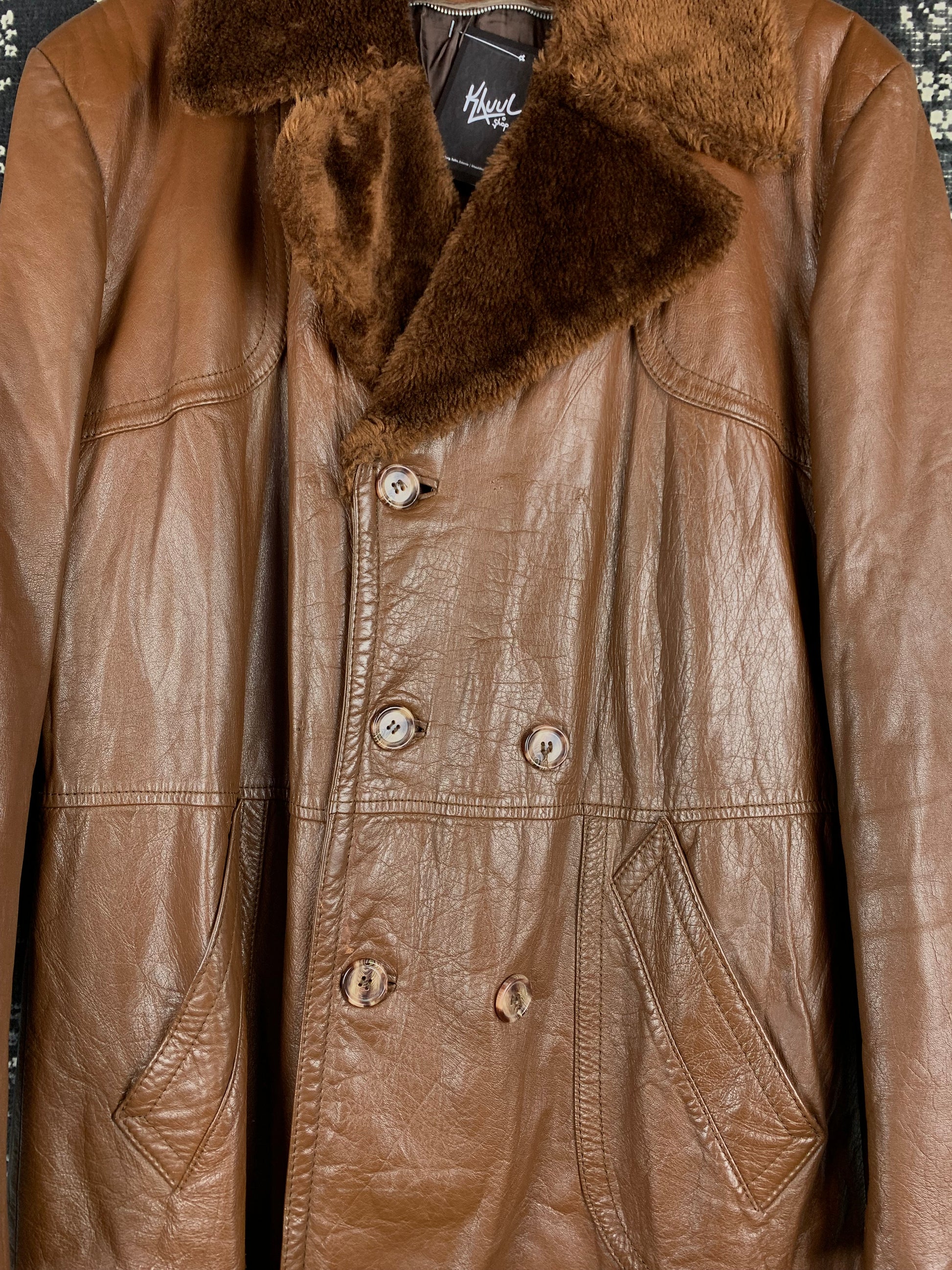 Vintage Leather Fur Collar Coat – 70s Double-Breasted Style – Size 42