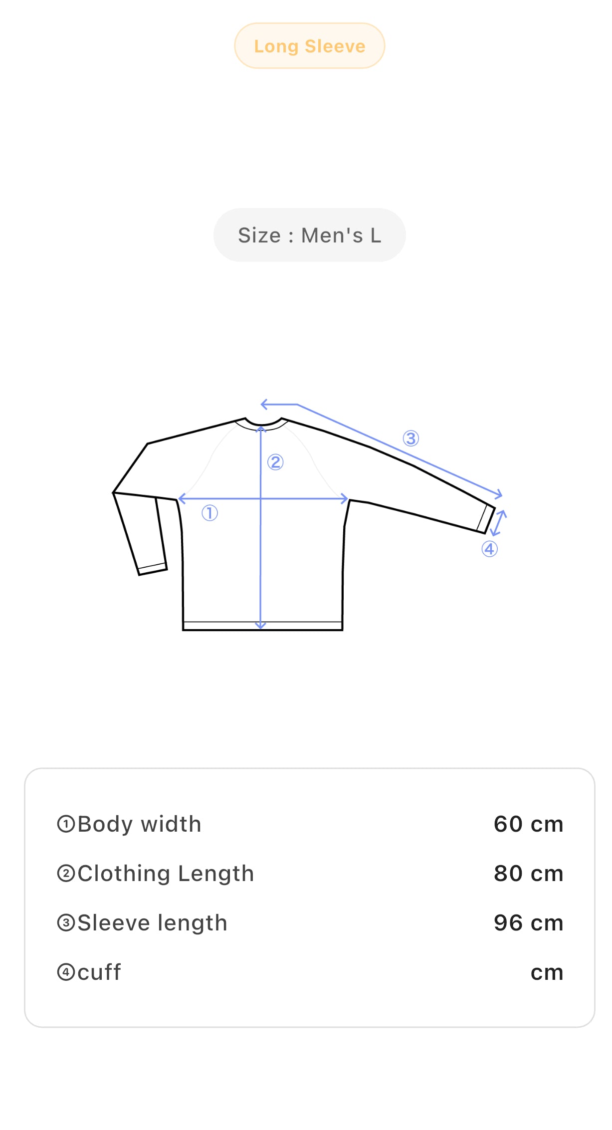 • Size: Men’s L — Body Width: 60 cm, Clothing Length: 80 cm, Sleeve Length: 96 cm