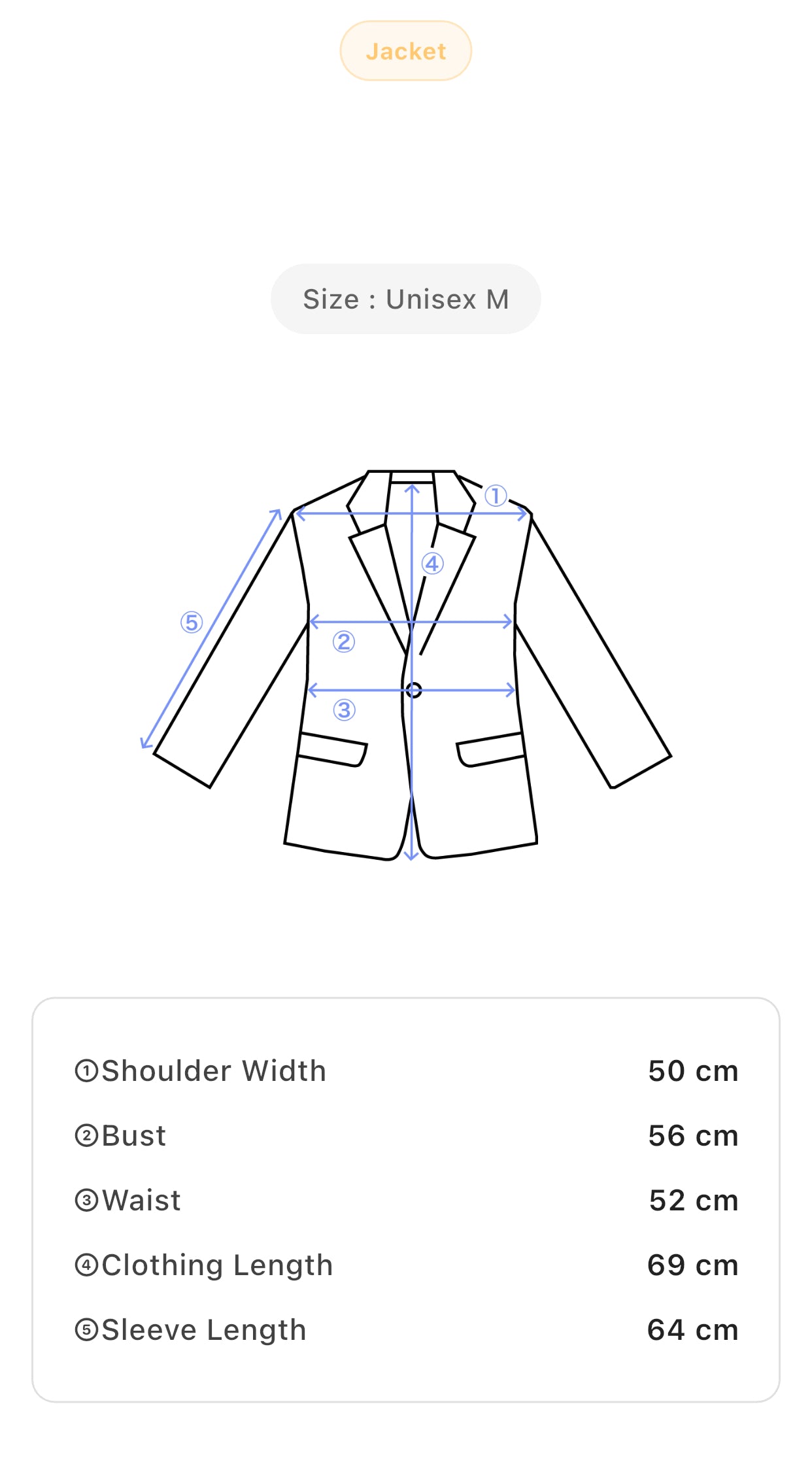 Size: Men M Shoulder Width: 50 cm • Bust: 56 cm • Waist: 52 cm • Clothing Length: 69 cm • Sleeve Length: 64 cm