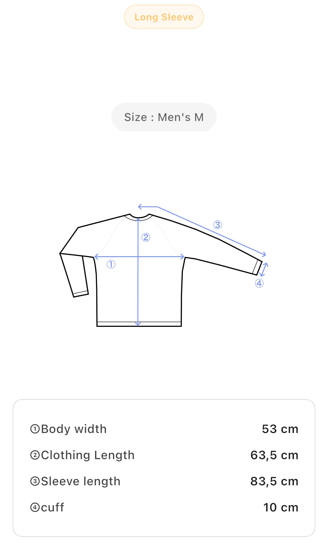 Size: Men’s M Body Width: 53 cm Clothing Length: 63.5 cm Sleeve Length: 83.5 cm Cuff: 10 cm