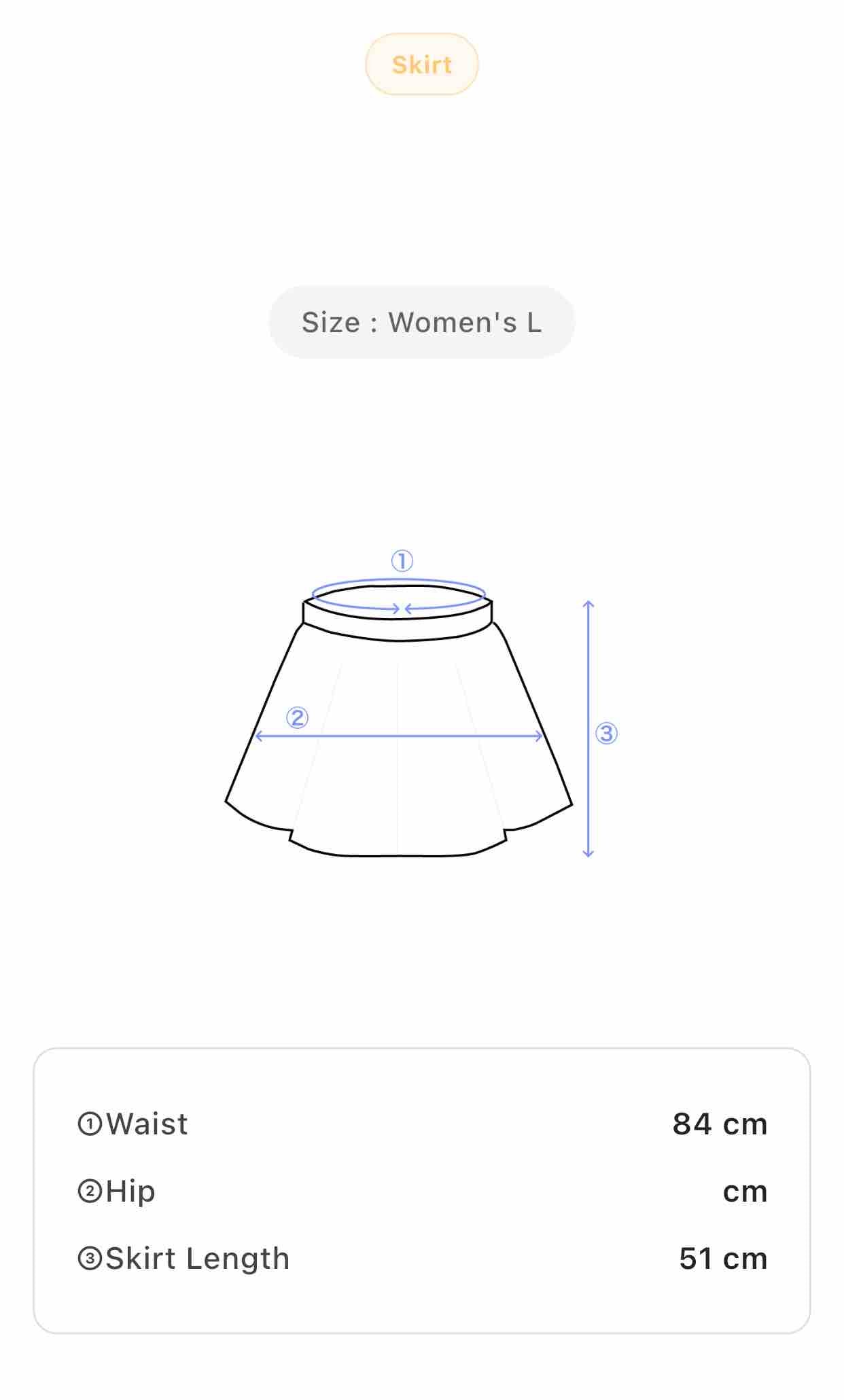 Size: Women's L — Waist: 84 cm, Skirt Length: 51 cm