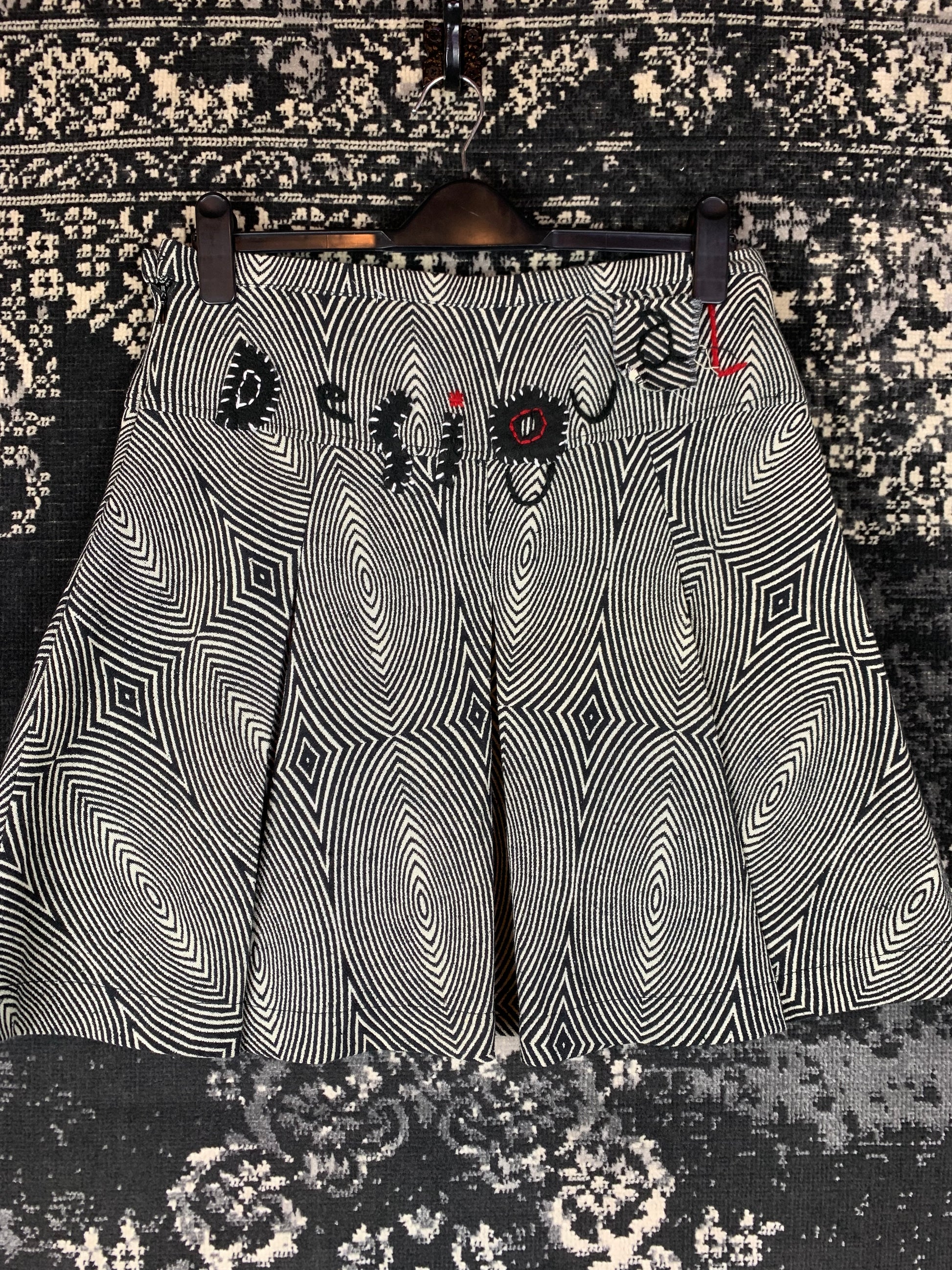 Desigual Black & White Optical Illusion Pattern A-Line Skirt - Women's Size L - Funky Y2K Retro Style with Embroidered Logo, Button Pocket Detail & Side Zip - Bold Graphic High Waist Skirt