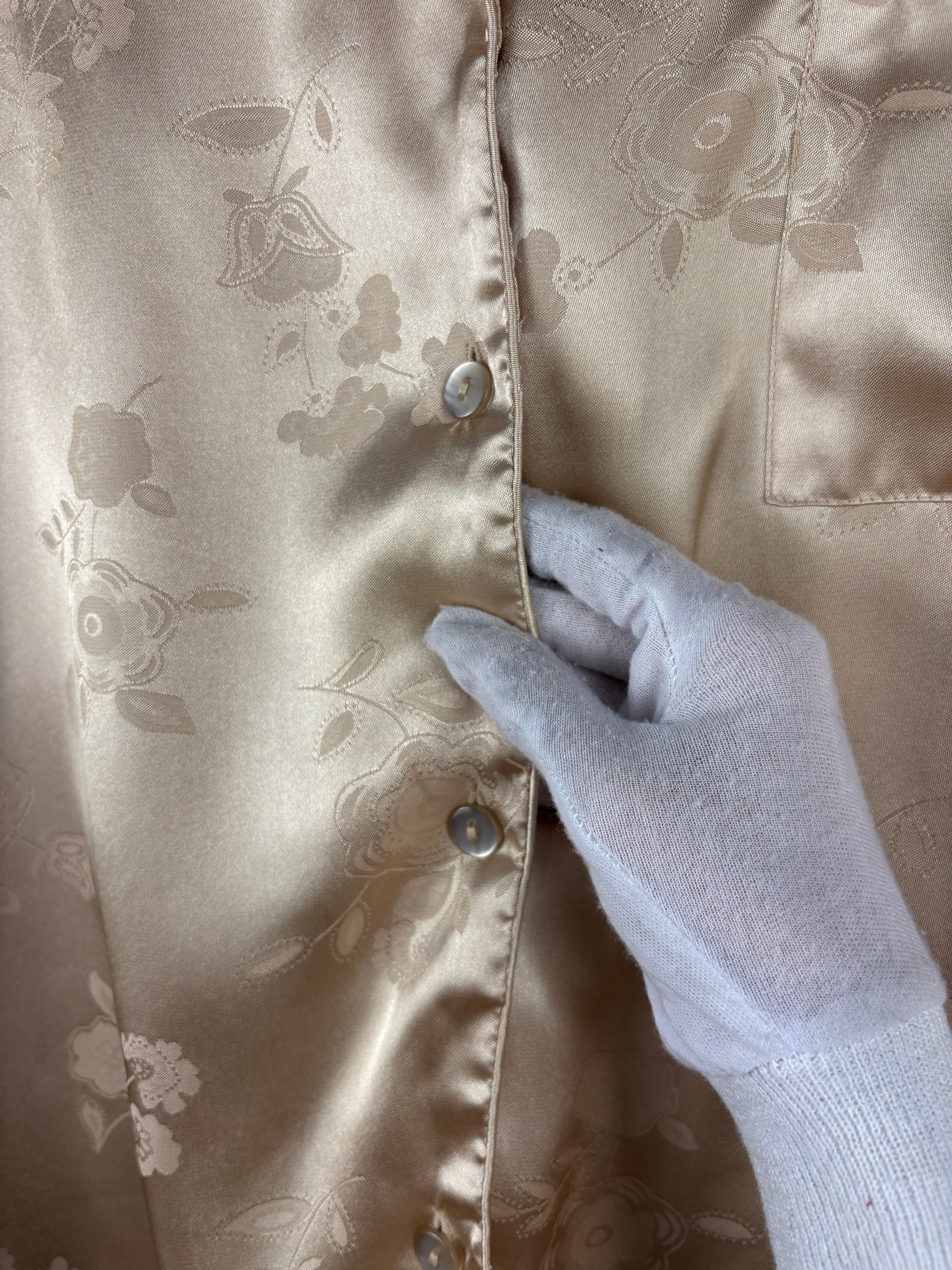 Womens Silky Beige Pajama Set - Floral Satin Two Piece Lounge Wear Button Up Top Wide Leg Pants Sleepwear Size L