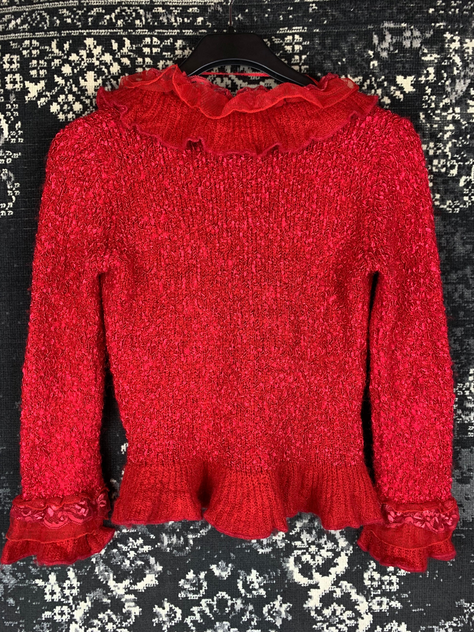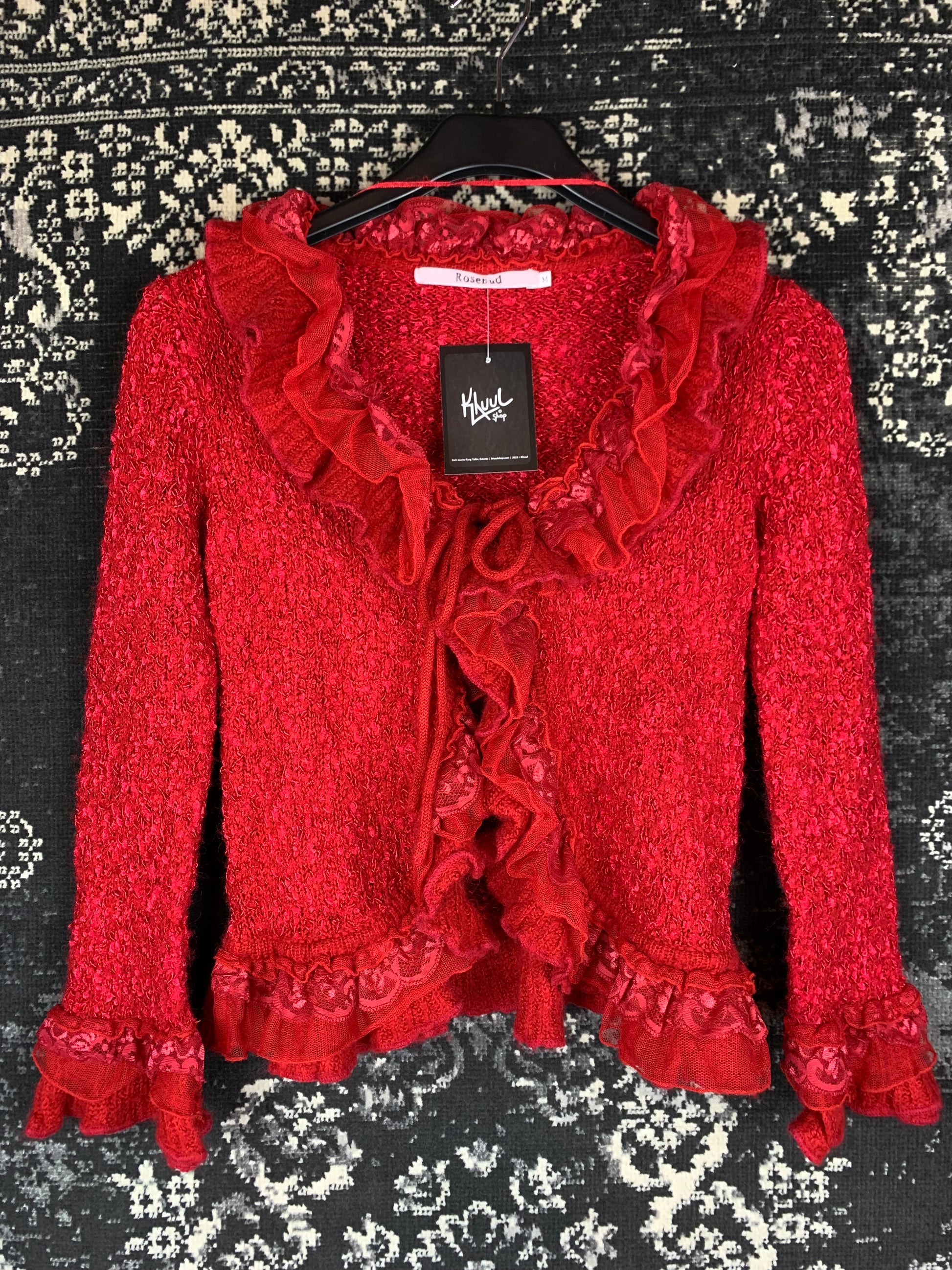 Romantic Vintage Red Knit Cardigan with Ruffle Trim for Women - Lace Detailed Y2K Soft Buttonless Sweater Top - Korean Fairycore Style - Size M