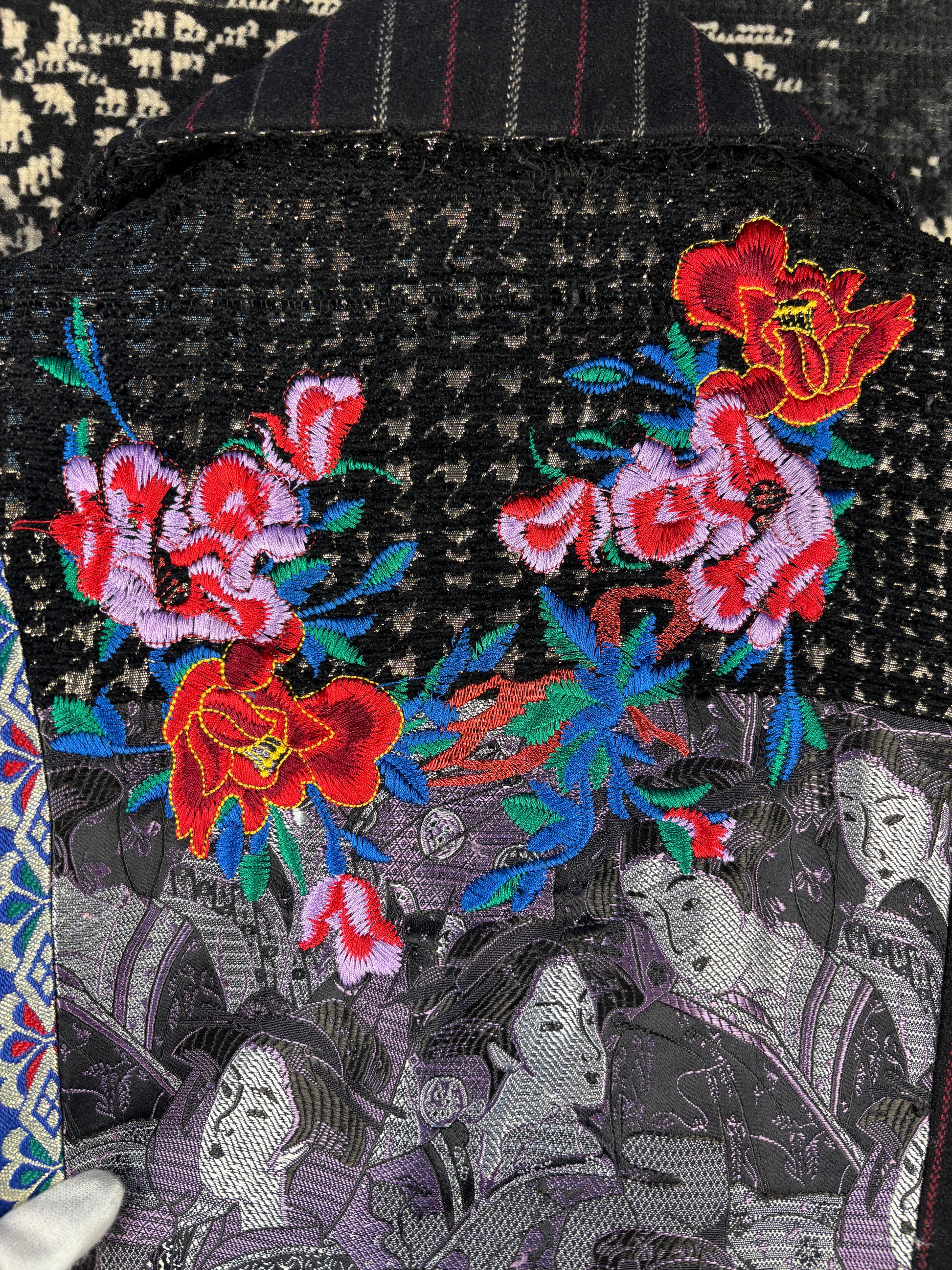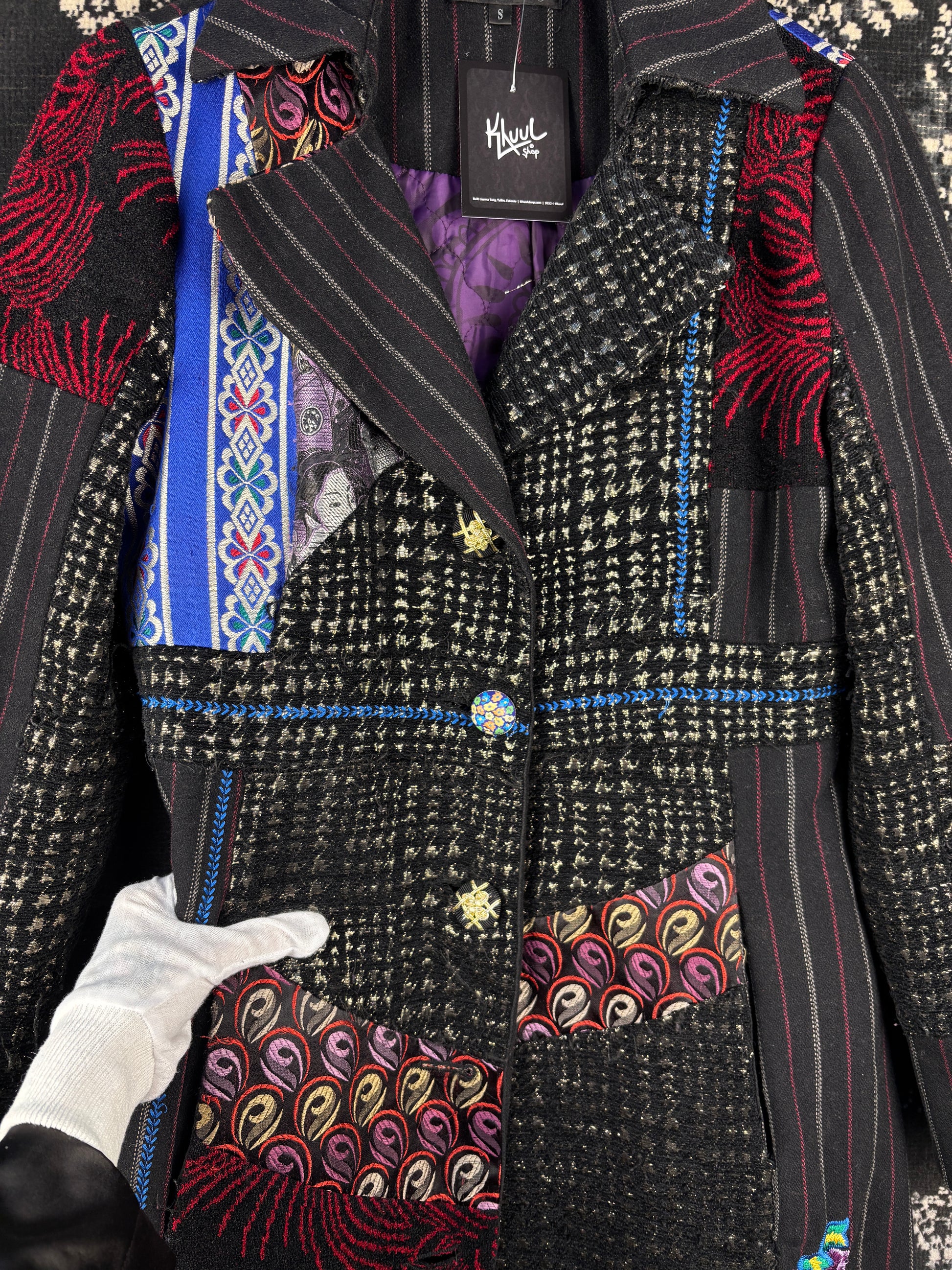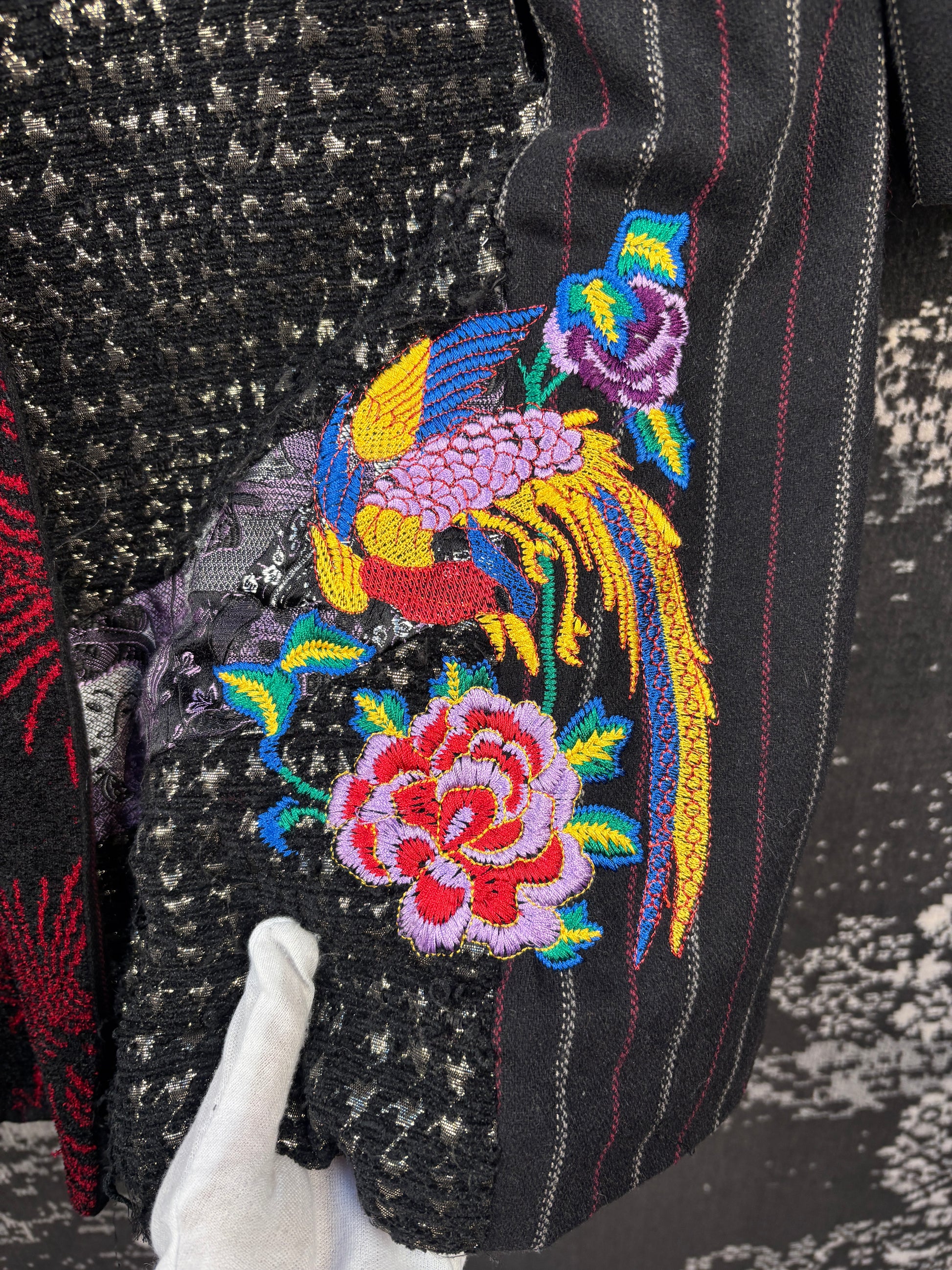 Women’s Vintage Funky Multi Pattern Long Coat – Patchwork Embroidered Floral Bird Design Artistic Statement Jacket