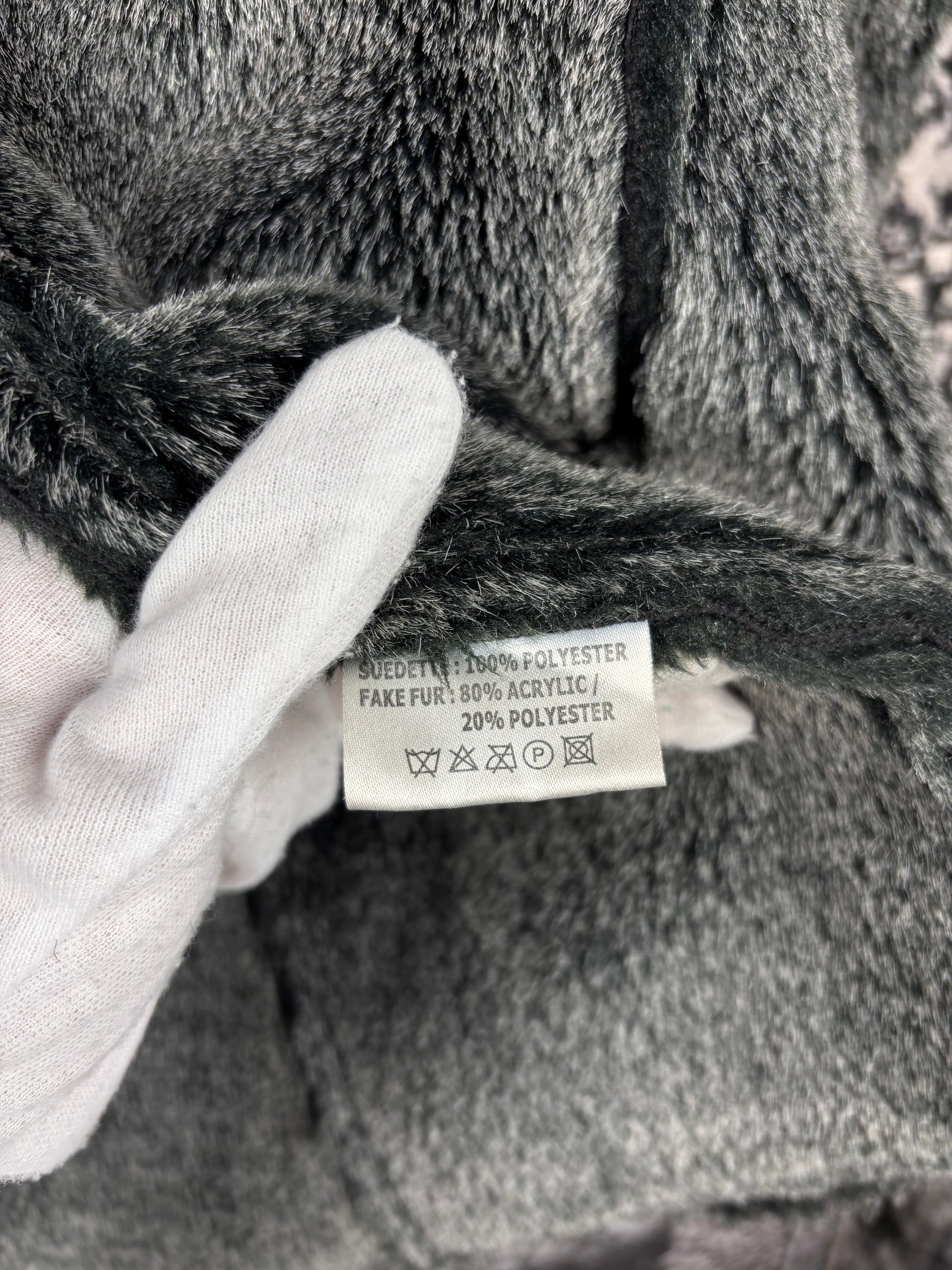 Women's Y2K Black Hooded Suede Coat with Faux Fur Trim and Button Front – Cozy Longline Winter Jacket with Soft Fleece Lining – L