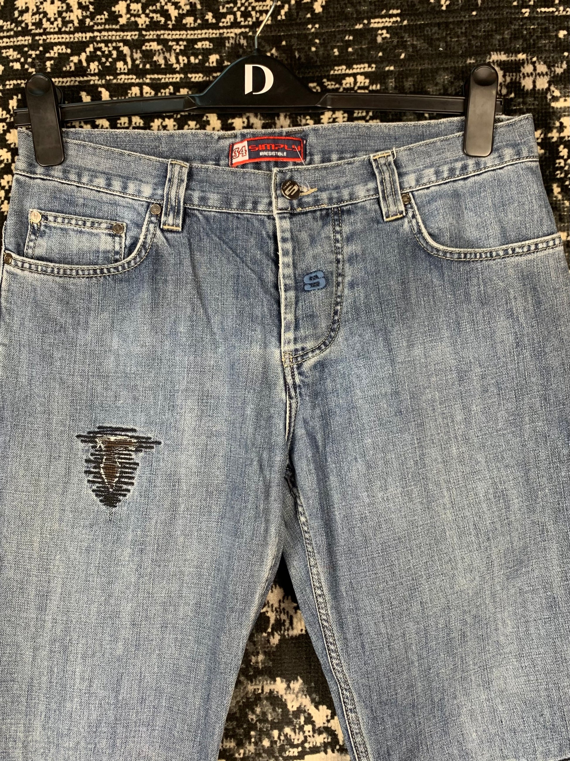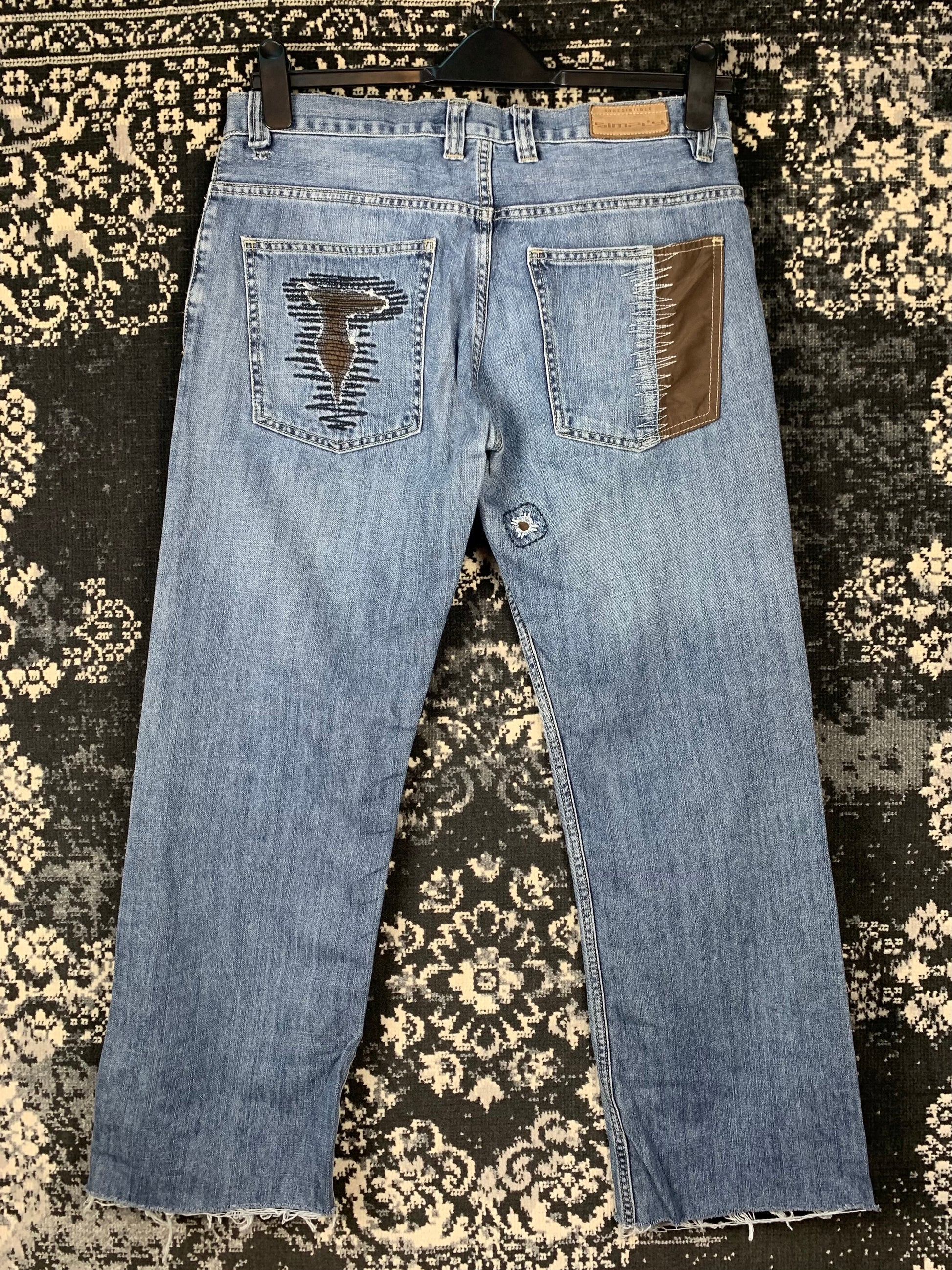 Womens Y2K Embroidery Detail Jeans – Light Wash Blue Denim Cropped Straight Leg 2000s Streetwear Grunge Patchwork Pants