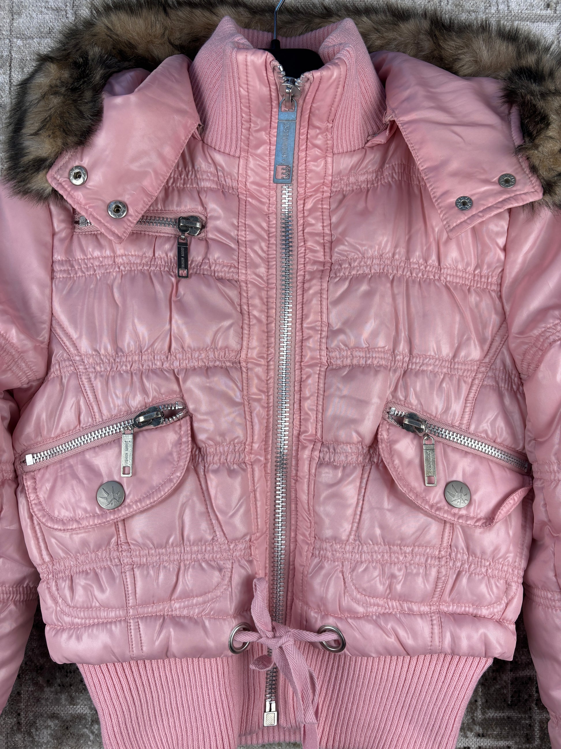Womens Y2K Pink Puffer Jacket Faux Fur Hood Cropped Bubble Coat Vintage Fashion Addict Zip Up Winter Jacket Retro Style