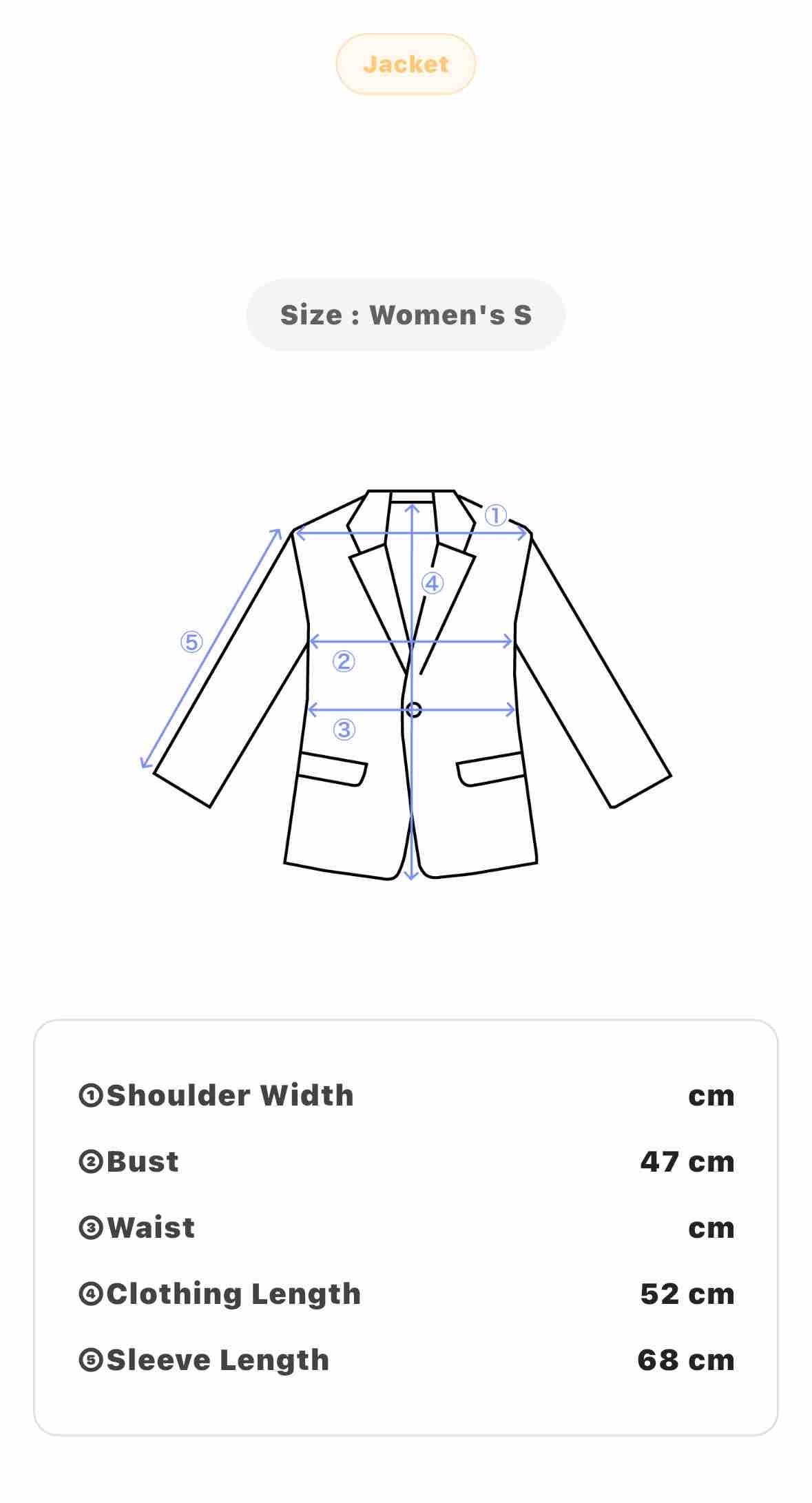 Size: Women's S - Bust 47 cm Length 52 cm Sleeve 68 cm