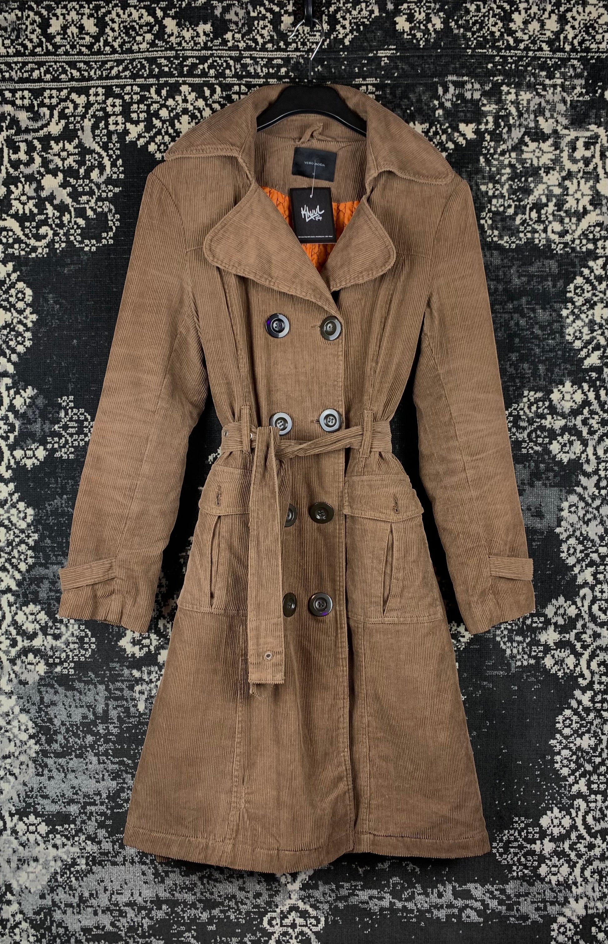 Womens Y2K Vero Moda Velvet Trench Coat – Double Breasted – Light Brown – Size M