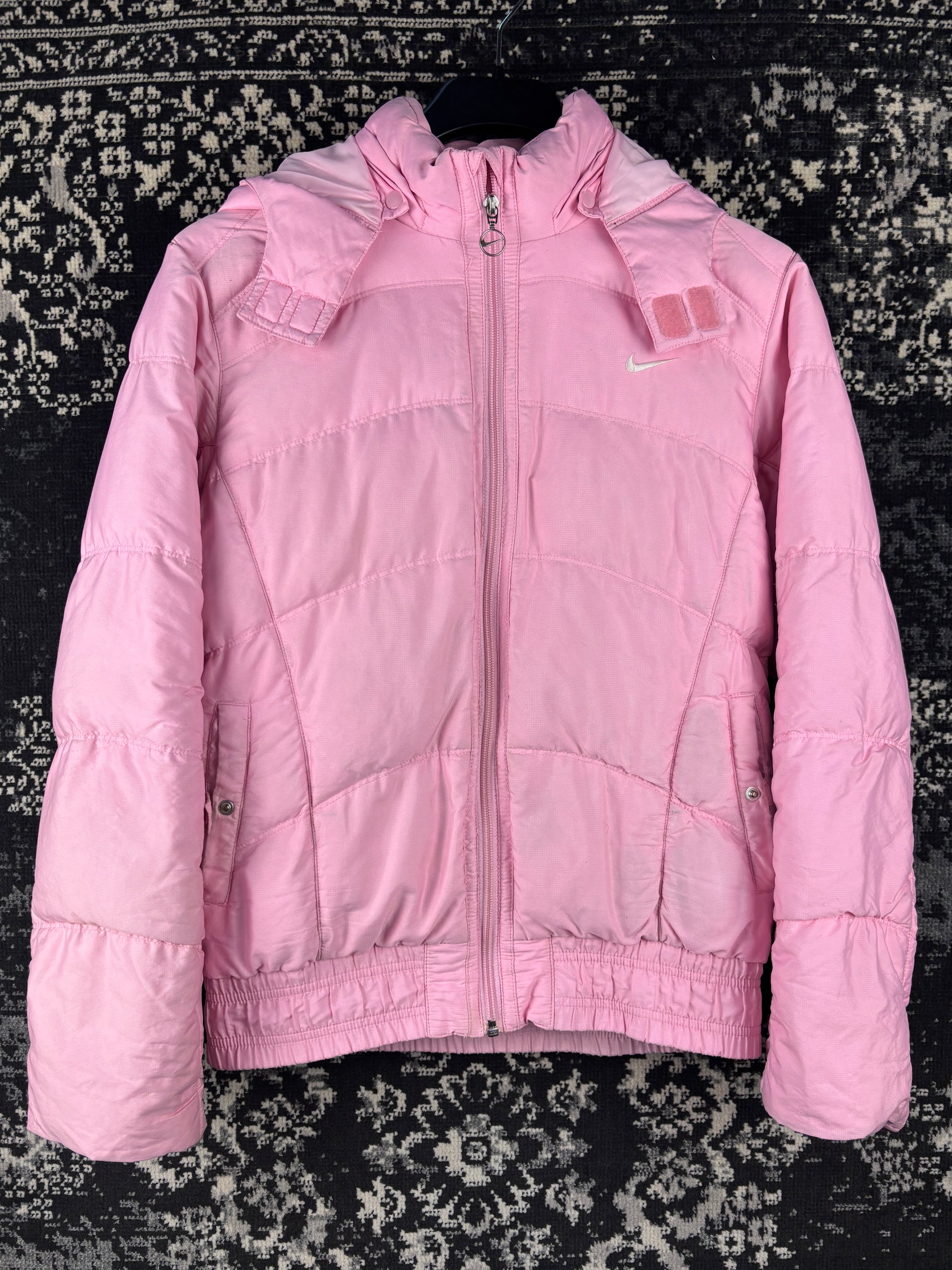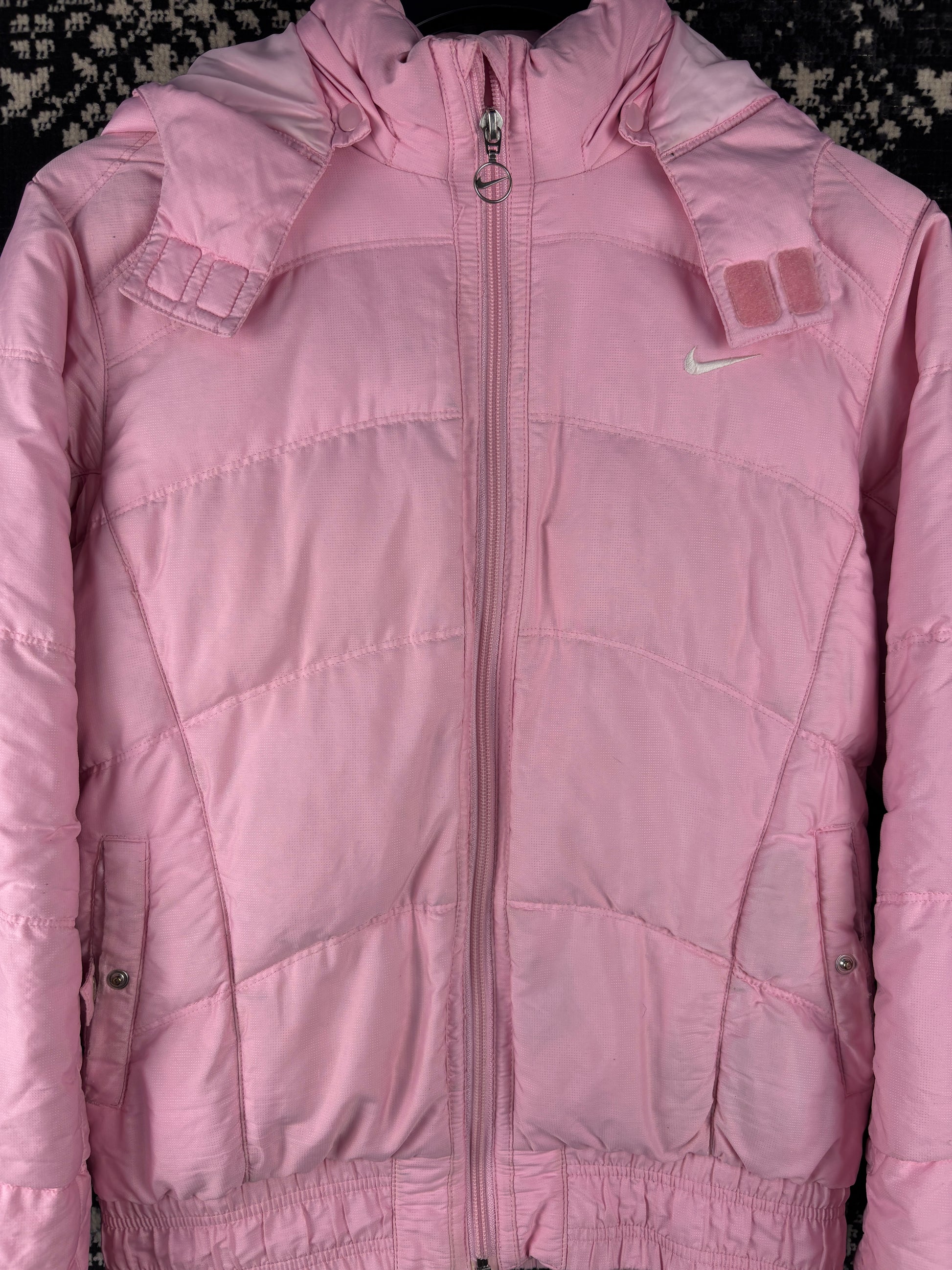Womens Y2K Nike Pink Puffer Jacket - Hooded Zip Up Quilted Winter Coat Retro 2000s Streetwear Bubble Jacket Size S
