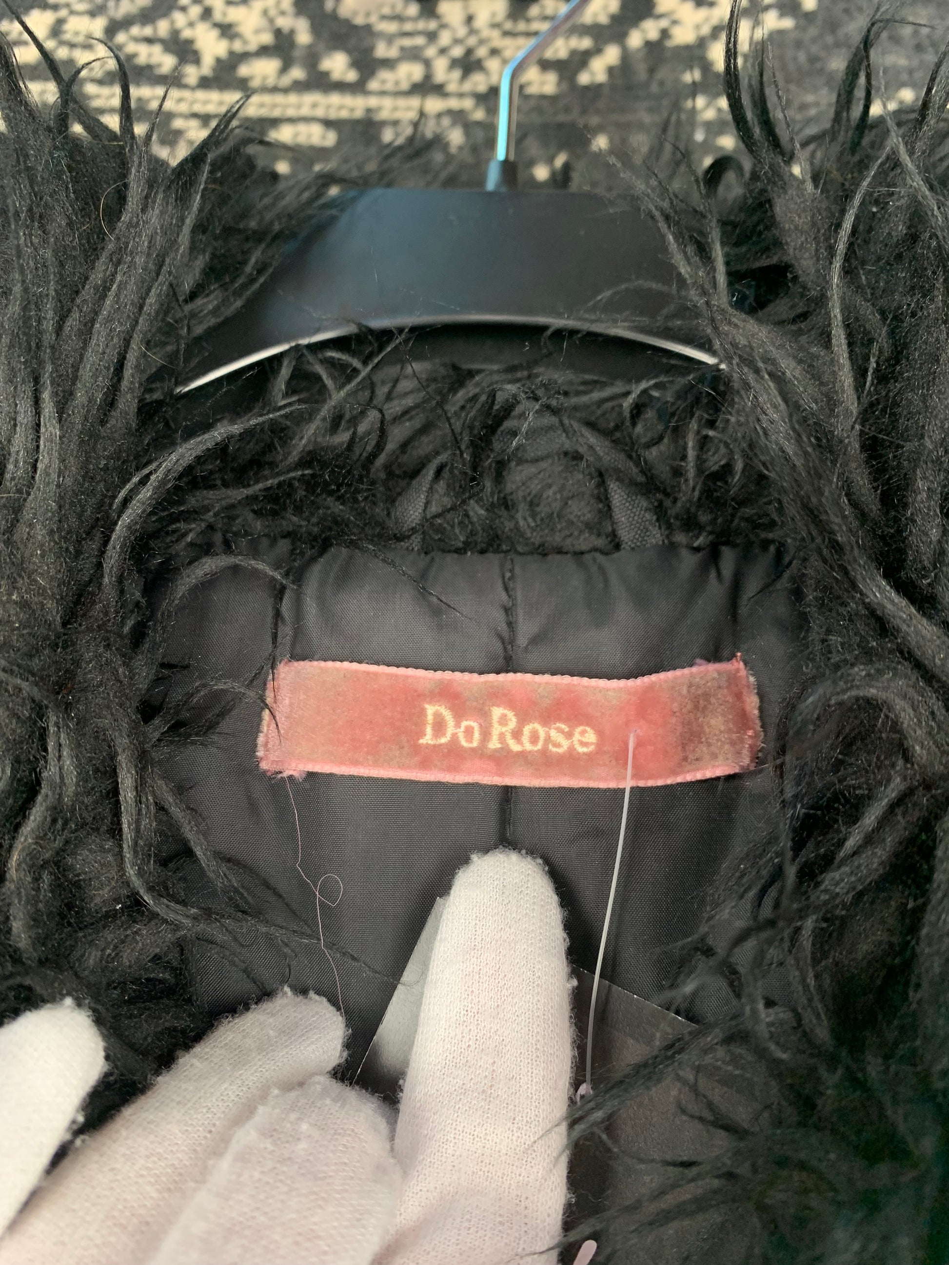 Color: Deep black with gold hardware accents and shaggy black faux fur trim on collar and sleeves