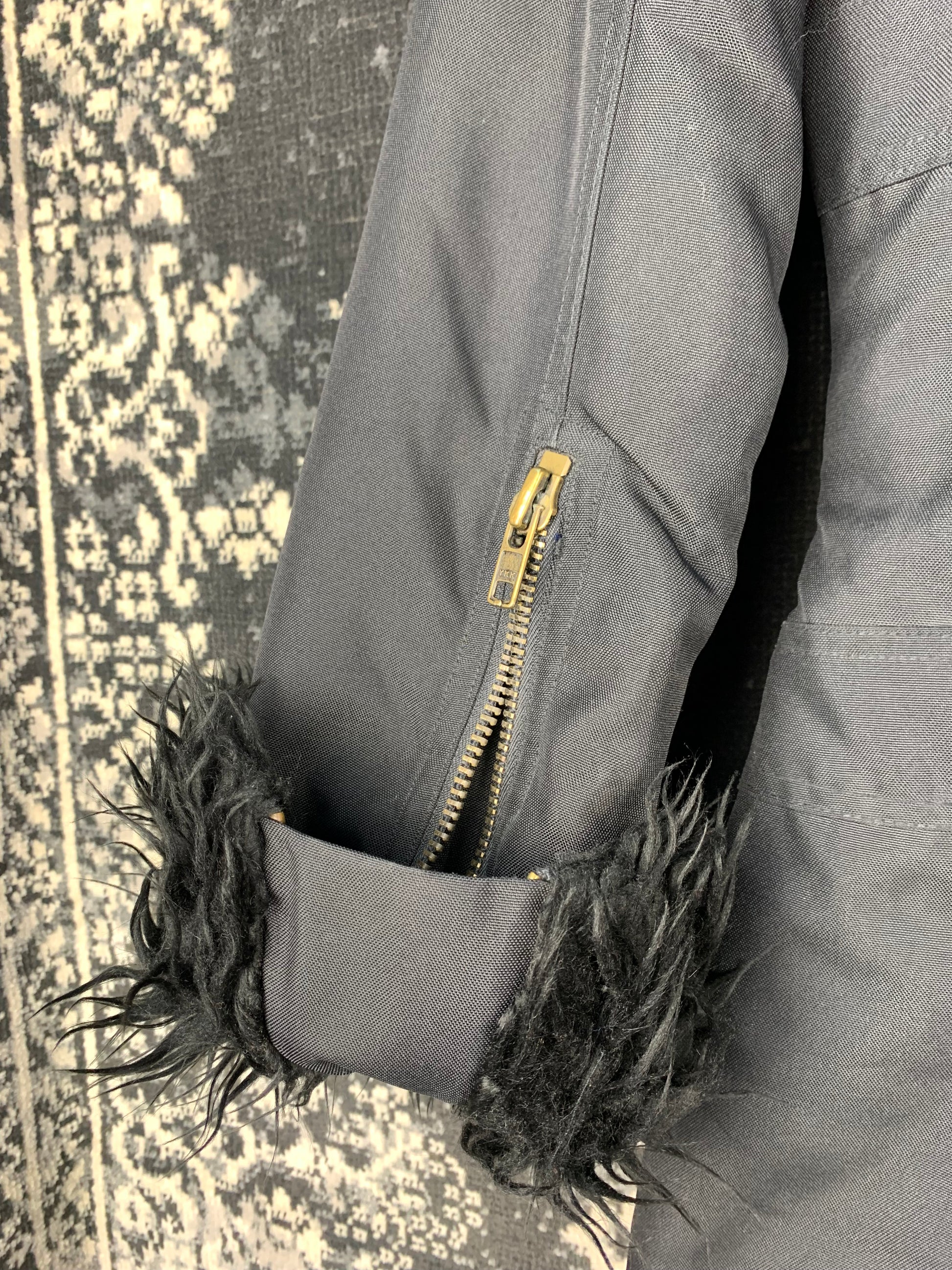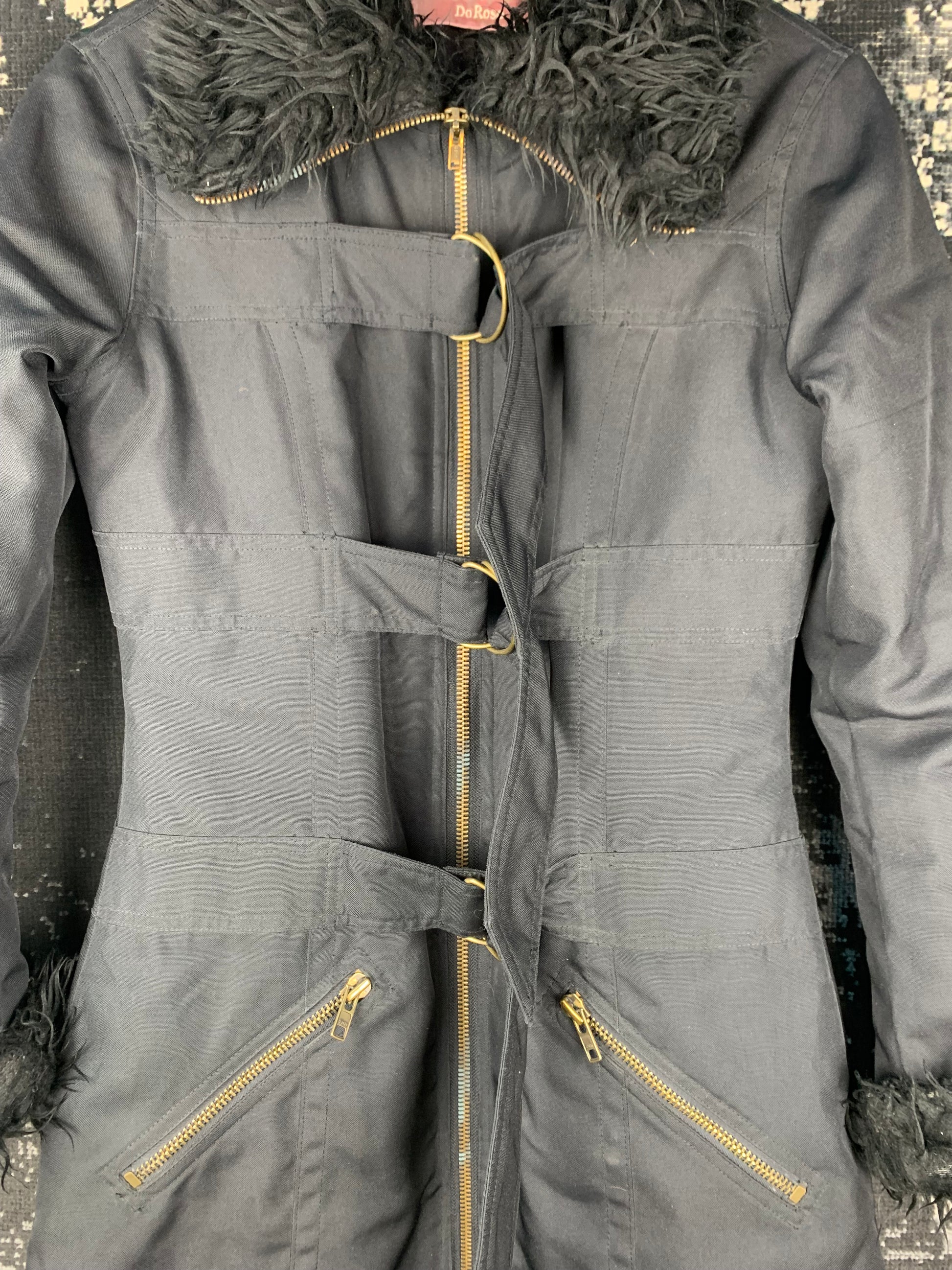 Y2K Women's Black Longline Coat by Do Rose with Faux Fur Collar & Cuffs, Gold Zippers, Waist Belt Straps & Edgy Streetwear Winter Look