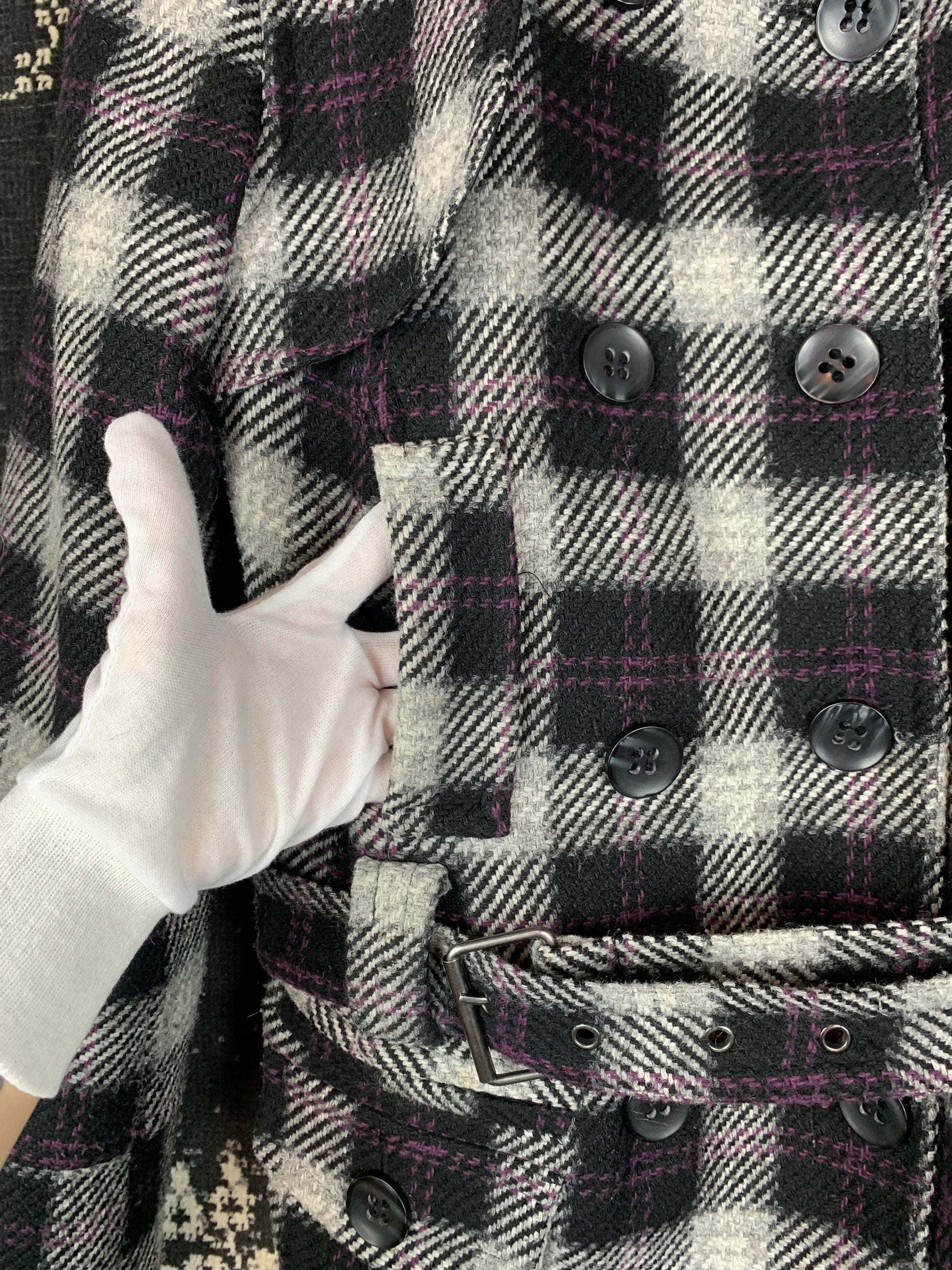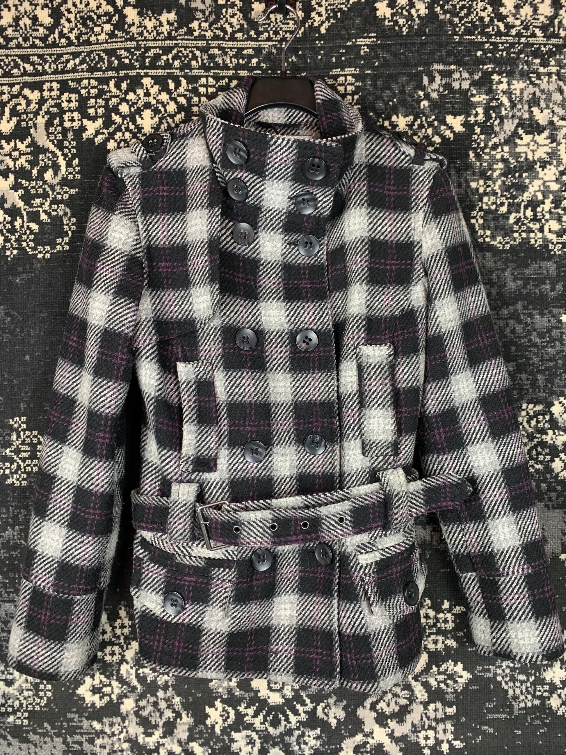 Clockhouse Y2K Style Checkered Wool-Blend Double-Breasted Jacket with Belt - Women's M - Retro Plaid Peacoat with High Collar and Epaulettes - Vintage Street Style Winter Outerwear