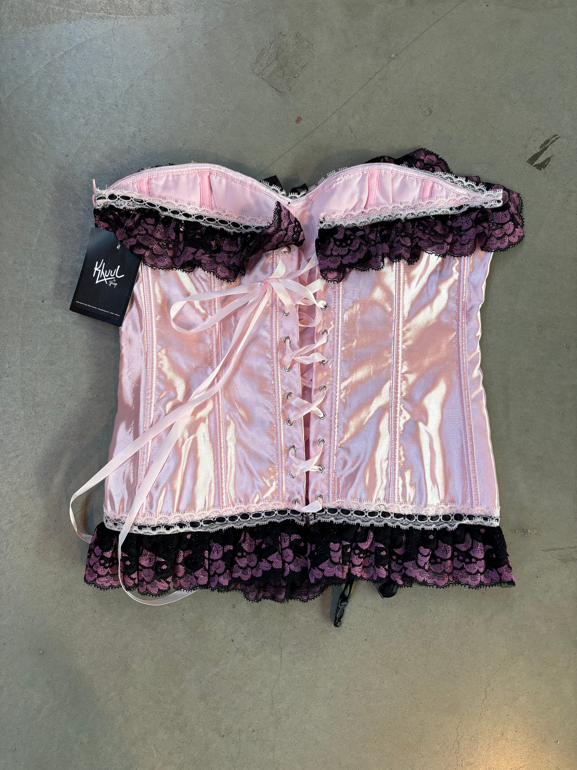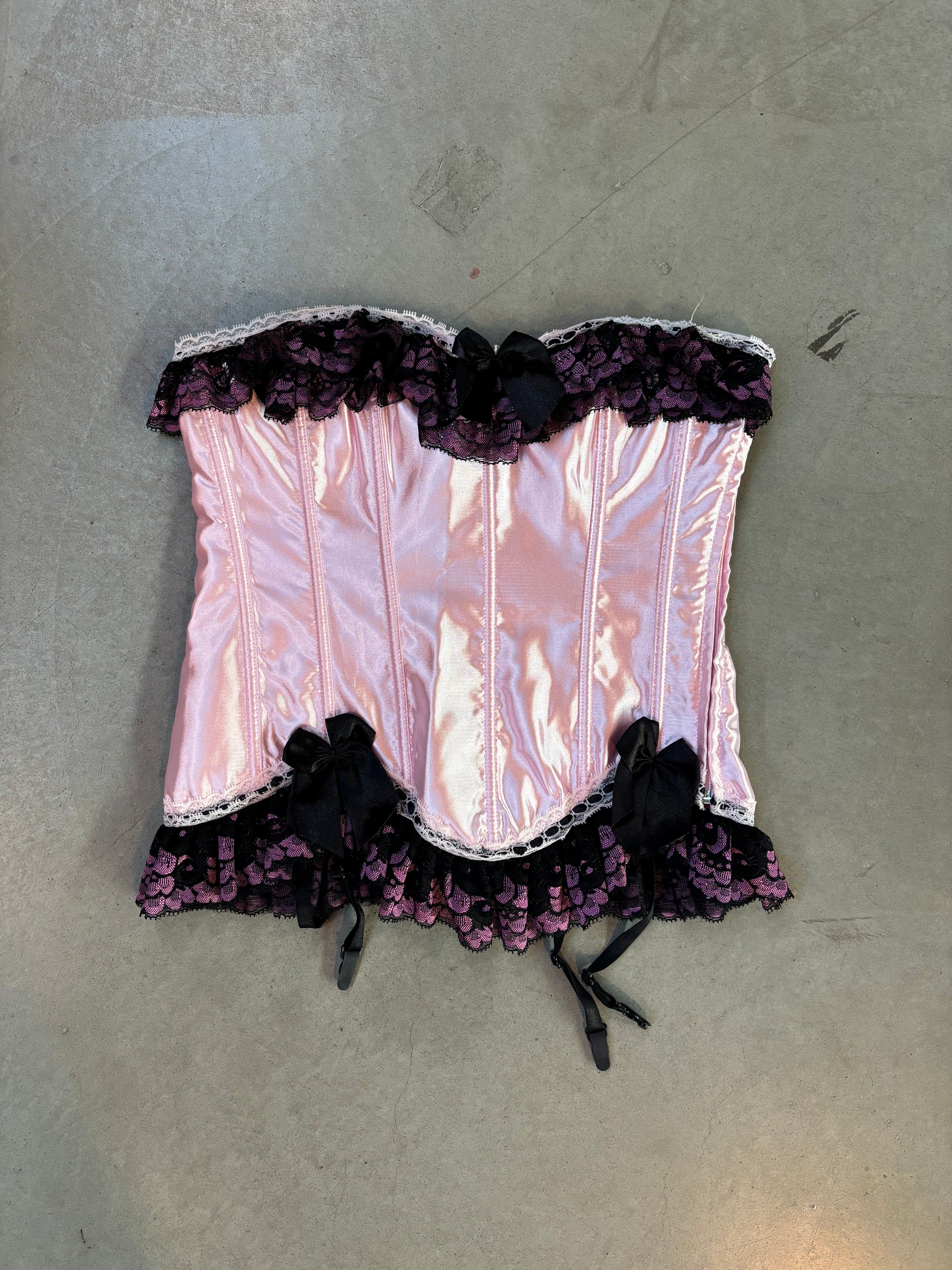 Pink Satin Corset Top Women’s XS Vintage Style Lace Bustier with Black Bow Trim and Adjustable Lace-Up Back