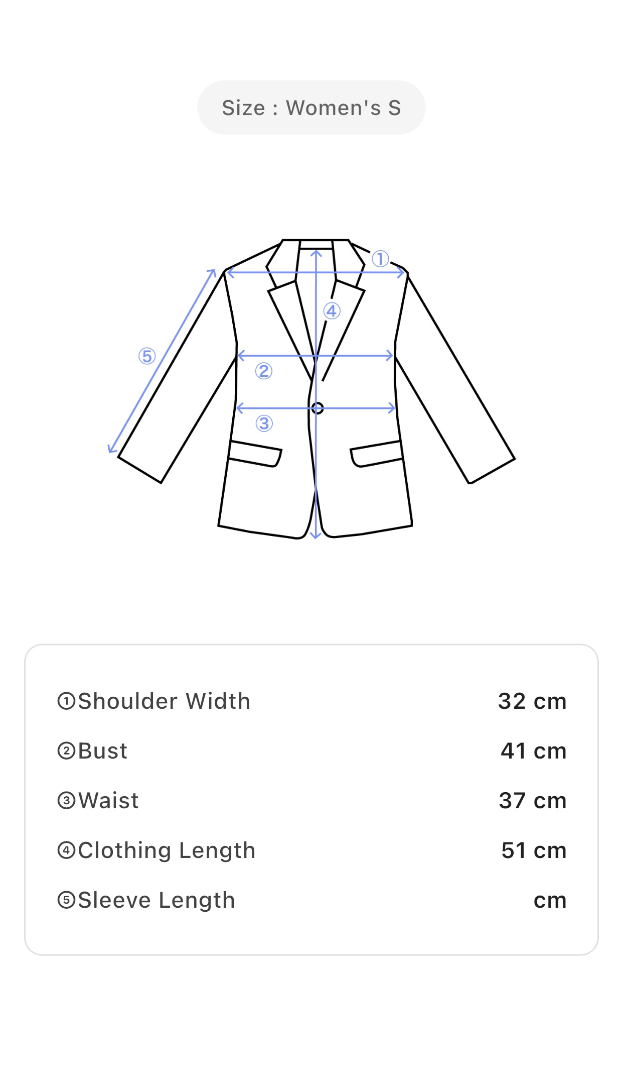Size: Women's S — Shoulder Width: 32 cm, Bust: 41 cm, Waist: 37 cm, Clothing Length: 51 cm