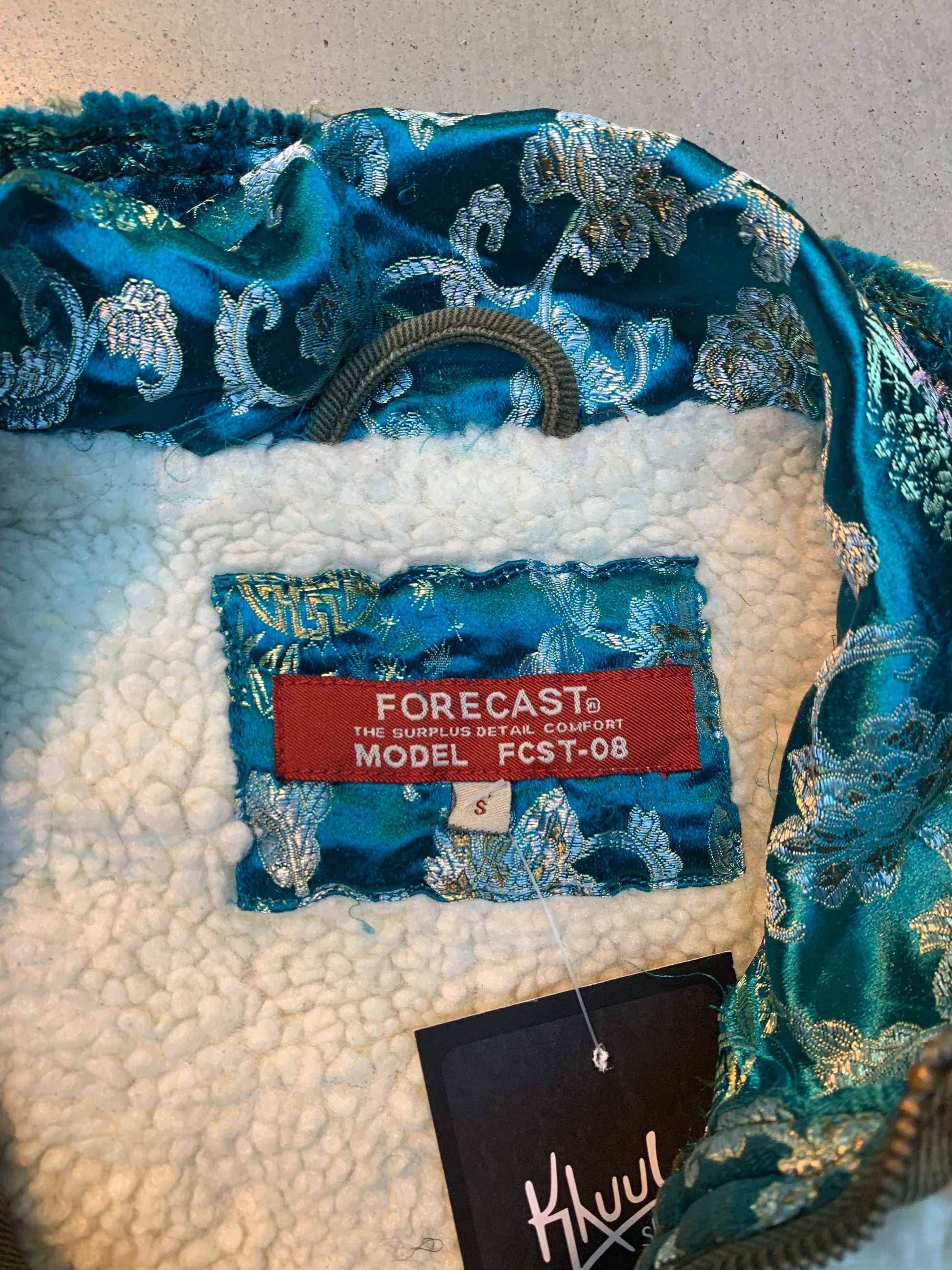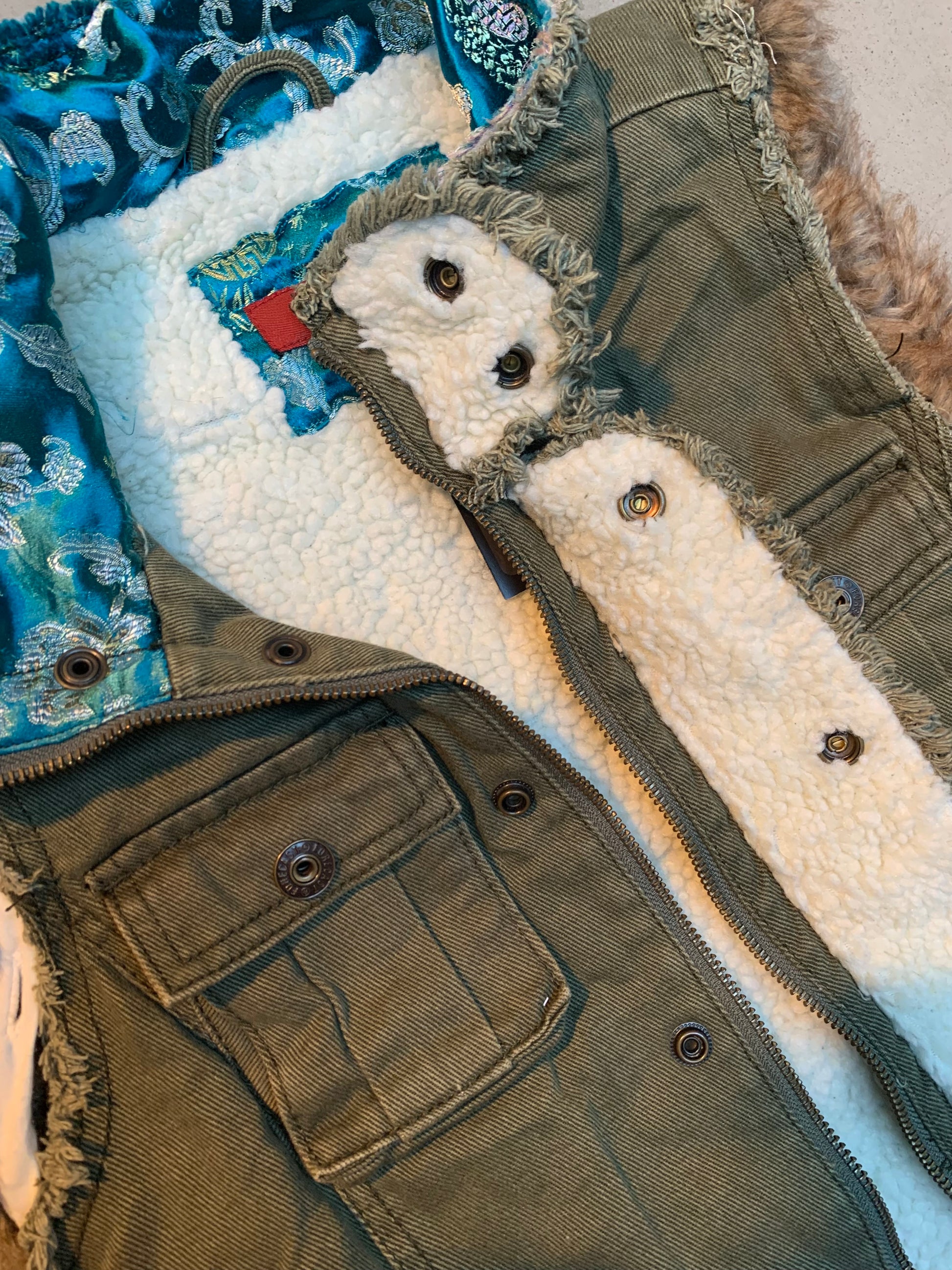 Y2K Khaki Green Forecast FCST-08 Sleeveless Denim Vest with Faux Fur Trim, Fleece Lining and Blue Satin Interior Size Small Retro