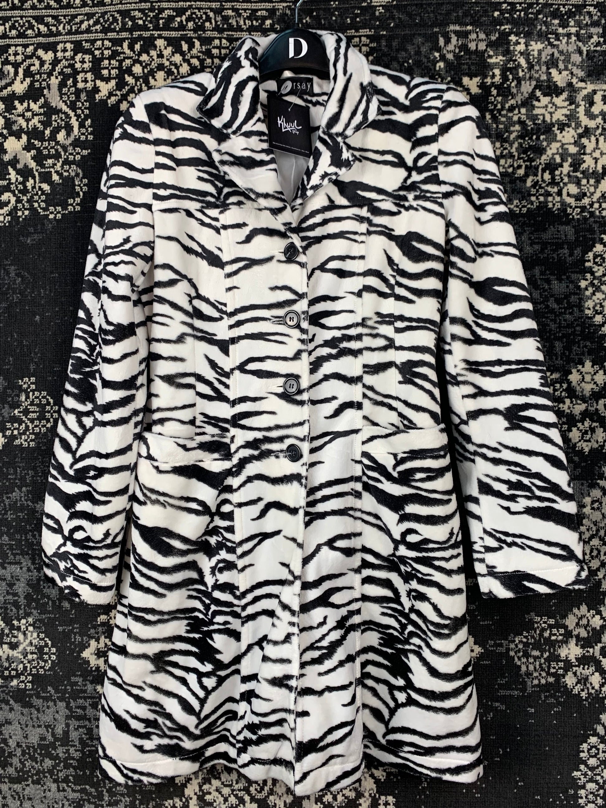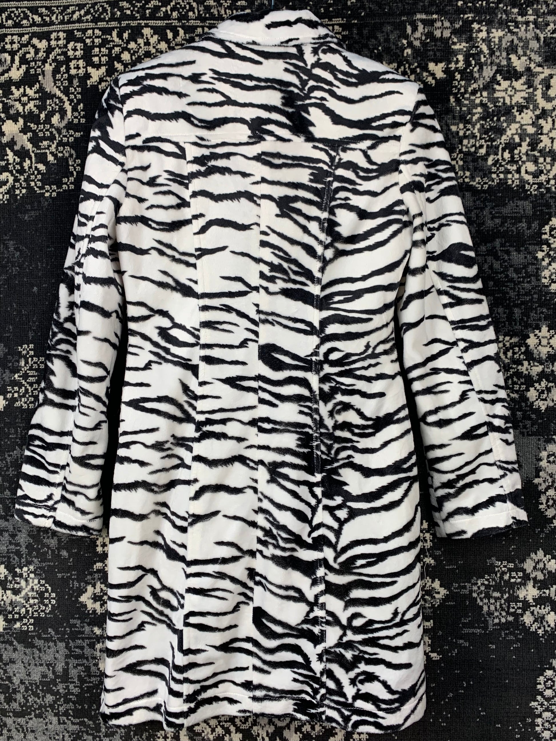Womens Y2K Zebra Pattern Faux Fur Coat - Black and White Animal Print Long Statement Jacket with Button Front and Classic Collar Retro 2000s Style Outerwear