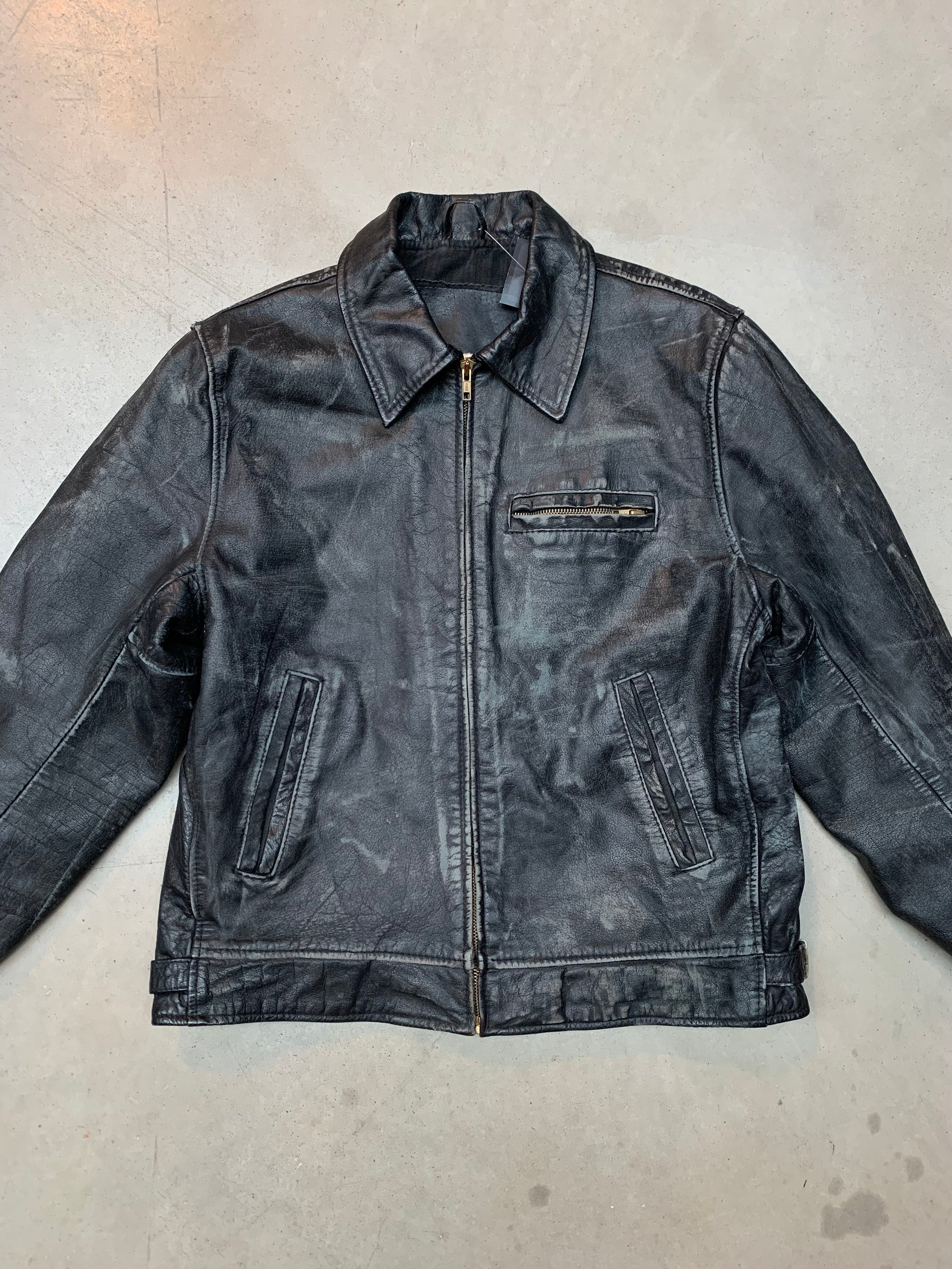 Vintage Wornout Black Gray Leather Jacket with Front Zip and Chest Pocket - Distressed Men's S Moto Style Outerwear with Rugged Finish