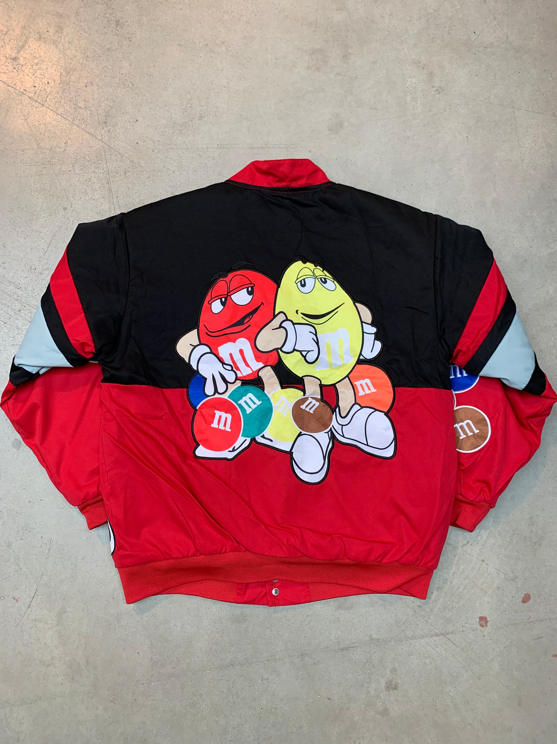 Y2K Unisex Red M&M Bomber Jacket – Retro Statement Outerwear with Bold Graphic Design